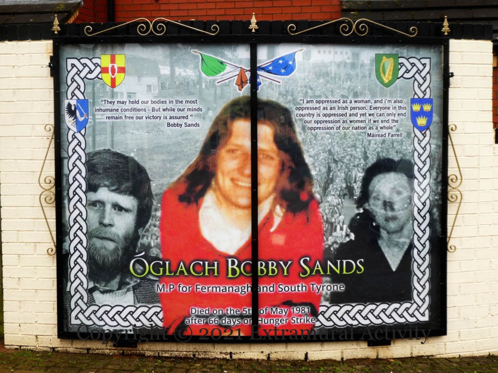 Mairéad Farrell (on the right of the image above) was arrested for planting a bomb at a hotel in Dunmurry in April 1976, one month after Special Category Status for republican prisoners had been revoked. Kieran Nugent (on the left) began the “blanket” protest in September that year and Farrell was the first person to join the protest, when she arrived in Armagh women’s prison to begin her fourteen year sentence. She later took up a dirty protest and joined the 1980 hunger strike. She stood for election in 1981 (in Cork), but, unlike “Óglach Bobby Sands, MP for Fermanagh and South Tyrone”, was not successful. (WP)
