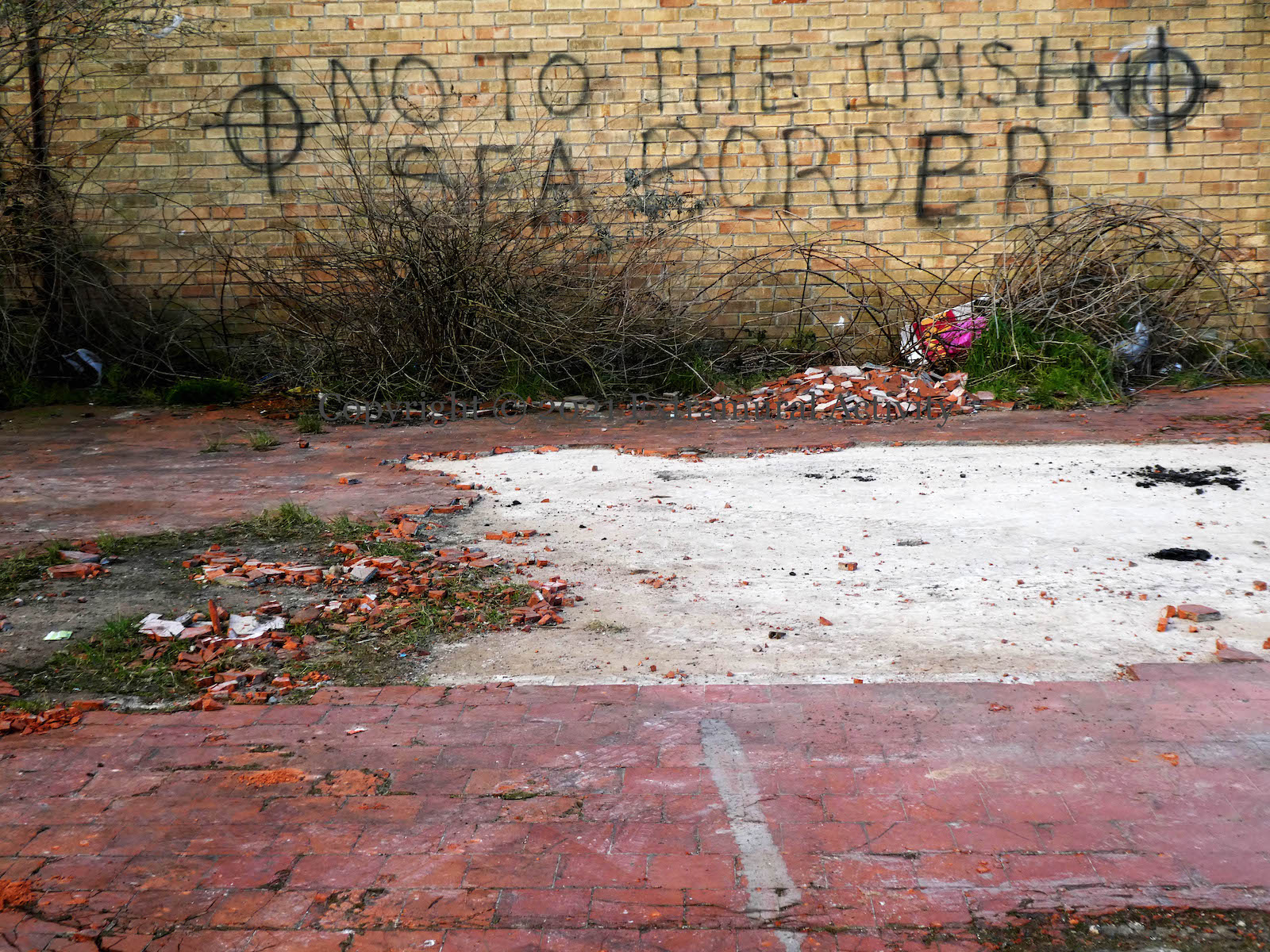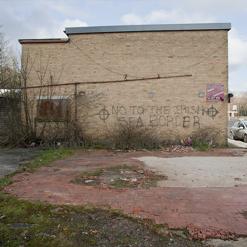 The long-term extent of disruption to goods entering Northern Ireland, caused by Brexit, remains unclear: some fresh veg and cheeses are missing from supermarkets and Amazon has stopped shipping alcohol. The problem of businesses no longer shipping at all seems to be more troublesome than delays in goods shipped. DUP leader Arlene Foster caused confusion and satirical comment on twitter yesterday for her remarks that nationalists were suffering delayed parcels along with unionists (Irish Times), though graffiti such as is shown here – calling for the scrapping of the “Northern Ireland Protocol” – has so far been painted only in PUL areas.