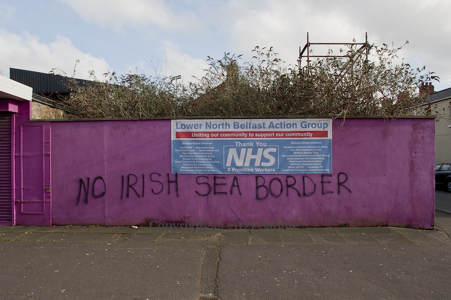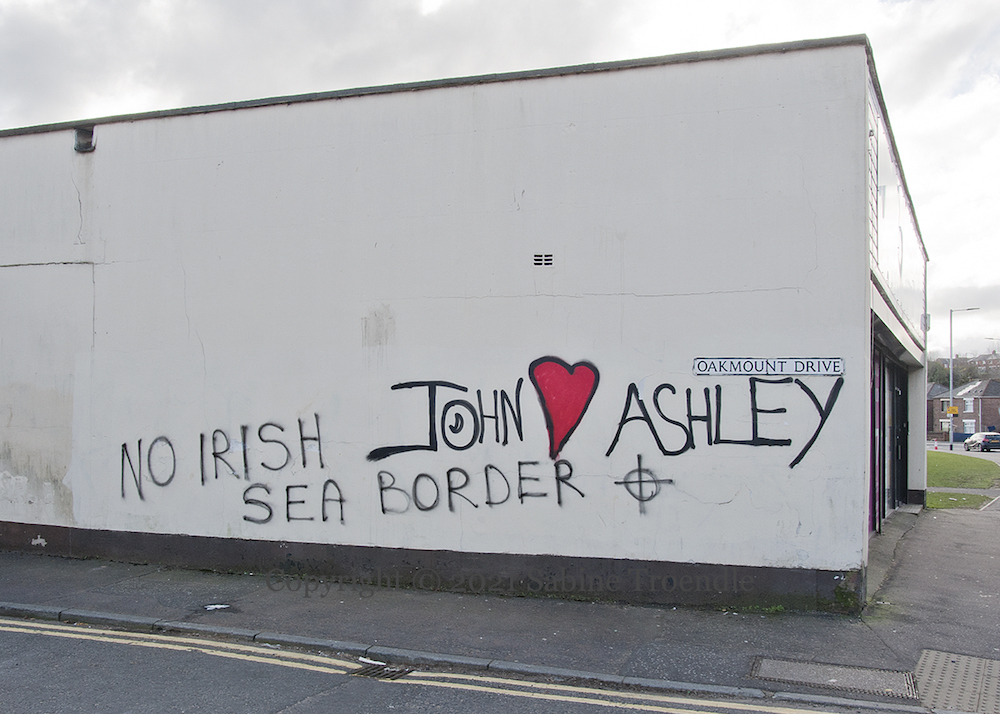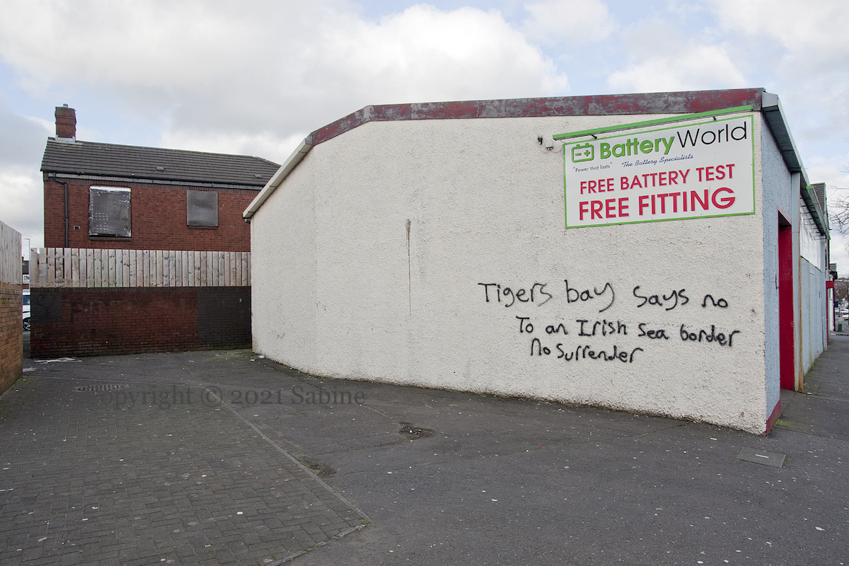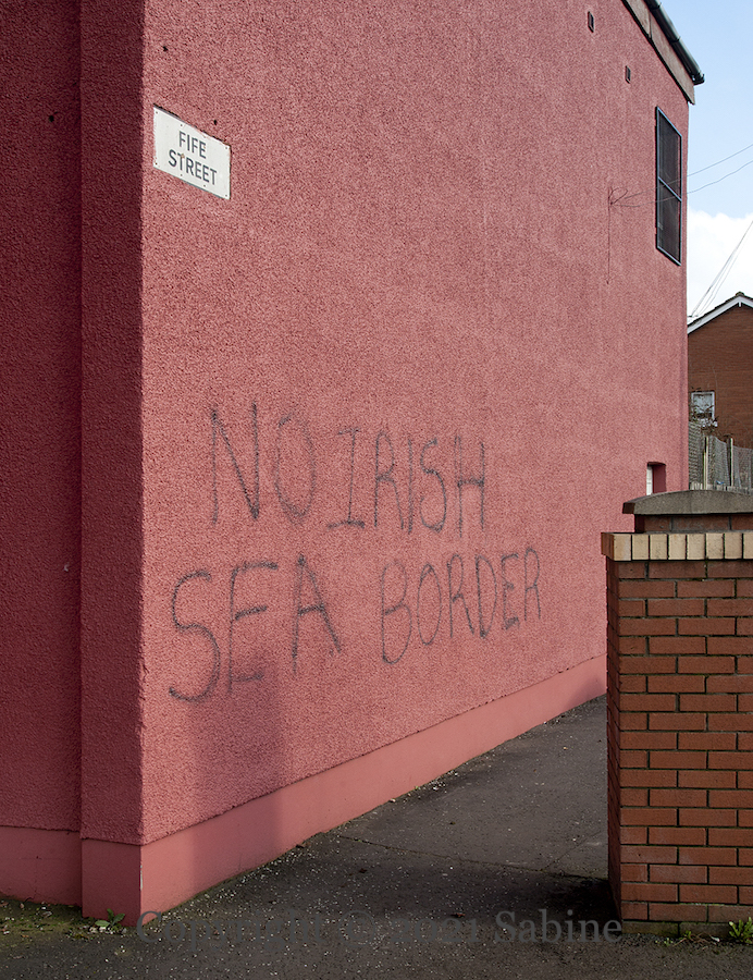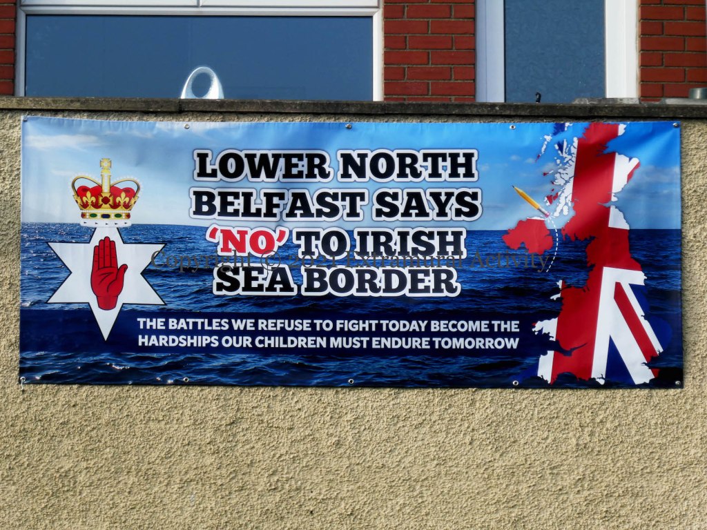 “The battles we refuse to fight today becomes the hardships our children must endure tomorrow.” We have amassed here five additional graffiti from “lower north Belfast” saying “No to an Irish Sea border”. Some operations at Larne and Belfast docks were suspended for over a week after reports – which police eventually did not deem credible – of threats made against employees and number plates being recorded (BBC timeline of events).