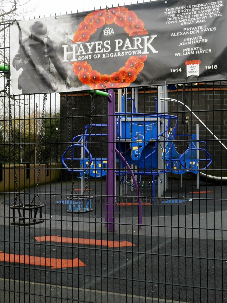 “This park is dedicated to three brothers who made the ultimate sacrifice defending their family, town and country in the Great War: Private Alexander Hayes, Private John Hayes, Private William Hayes.” Lurgan Ancestry would appear to give the third brother as Wesley, rather than Alexander. He and John died on the first day of the Somme.