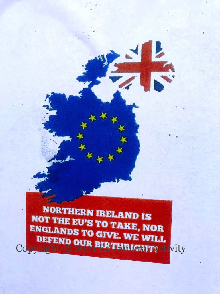 “Northern Ireland is not the EU’s to take, nor England’s to give. We will defend our birthright!” This sticker has been all over north Belfast (and perhaps beyond). Although Northern Ireland is shown as a Union flag, Britain is notably absent, consistent with the discontent expressed by “nor England’s to give”. Northern Ireland is shown only in relation to the rest of island, fleeing a Euro-member Ireland.