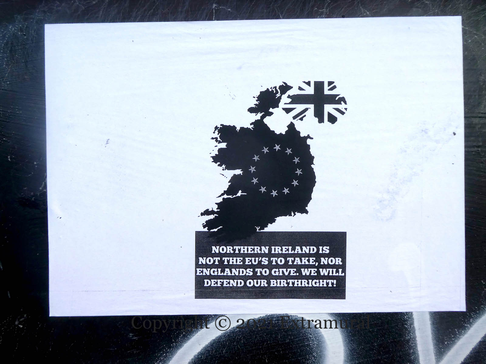 “Northern Ireland is not the EU’s to take, nor England’s to give. We will defend our birthright!” This sticker has been all over north Belfast (and perhaps beyond). Although Northern Ireland is shown as a Union flag, Britain is notably absent, consistent with the discontent expressed by “nor England’s to give”. Northern Ireland is shown only in relation to the rest of island, fleeing a Euro-member Ireland.