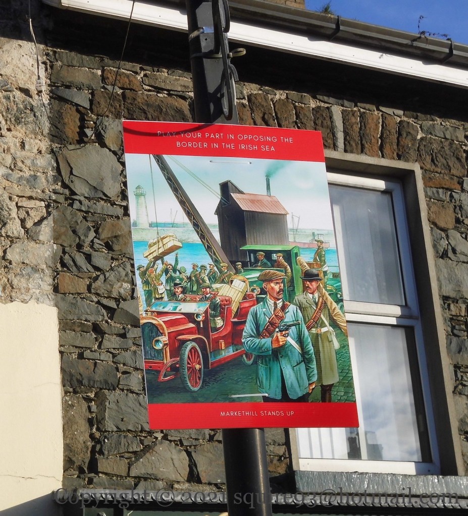 In the gunrunning by the Ulster Volunteers in April 1914, immediately upon docking in Larne weapons and ammunition were offloaded from the SS Clyde Valley onto two motor-boats which then headed for Donaghadee. A drawing of the unloading there, with the lighthouse in the background, was published as a postcard (you can see the b&w original at History Ireland). This time, of course, it’s not Home Rule that threatens unionists but the NI Protocol that is part of Brexit. “Play your part in opposing the border in the Irish Sea – Markethill stands up.”