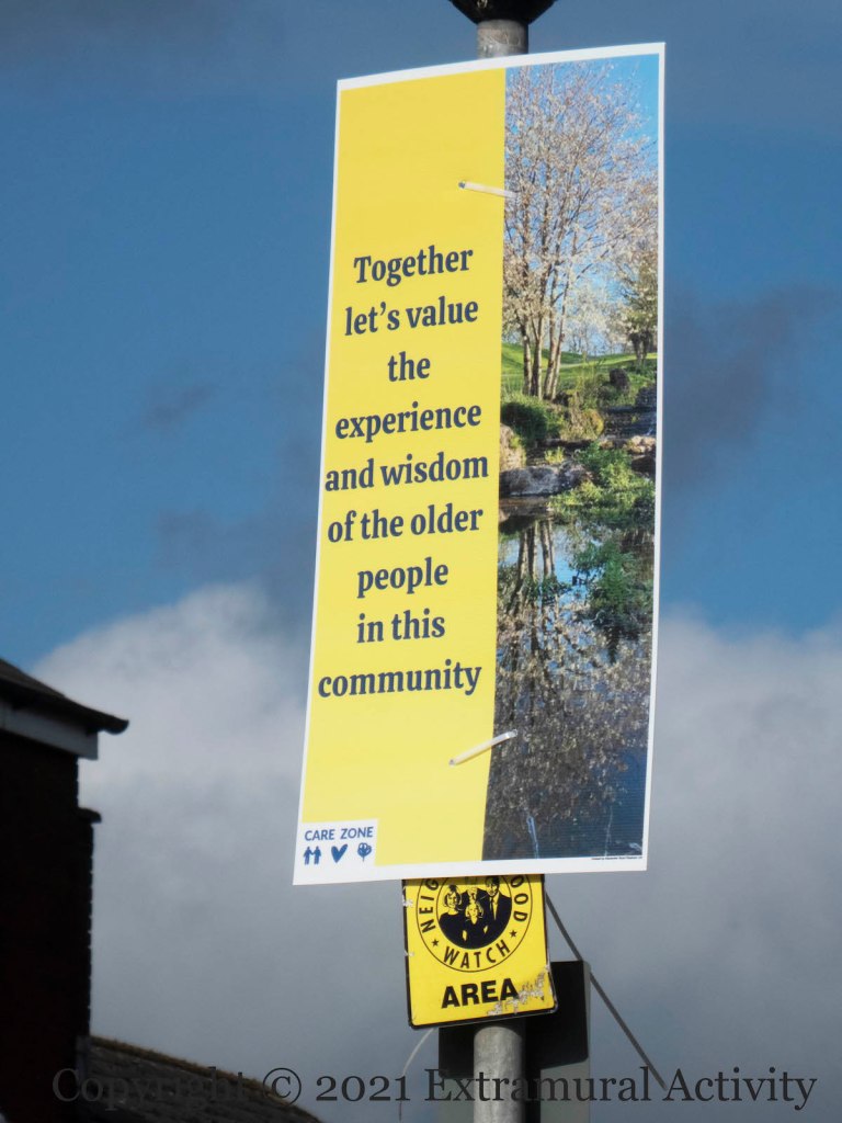 “Together let’s value the experience and wisdom of older people in this community.” The Care Zone community initiative (web) attempts to raise the quality of life – and in particular to tackle deaths by suicide – in the ‘Belfast North’ Assembly area. This poster campaign – which features images from the Waterworks – is directed at developing respect for the elderly.