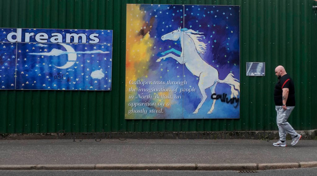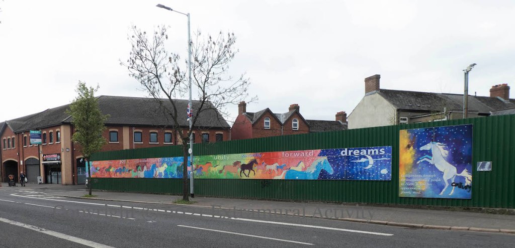 “Gordon ‘Galloper’ Thompson – the headless horseman of North Belfast …. The Gordon ‘Galloper’ Thompson mural has been designed and created by young people from the Tiger’s Bay, New Lodge and York/Shore Rd areas of North Belfast as part of the CIRCA project delivered by Arts for All. … According to local legend, Gordon Thompson claimed that if he died and didn’t get into heaven, he would come back to haunt his ancestral home of Jennymount. An apparition of a man on horseback (with his head tucked under his arm) is rumoured to have been seen around Jennymount Mill where it is believed he was decapitated in an accident while fixing one of the weaving machines. Often parents used this tale to encourage their children to come in before dark. Many people still remember their parents telling them to be in for a certain time or: “Galloper Thompson will get ye.” ” (The text is from Joe Baker’s Haunted Belfast. More info from Walking Tours Belfast.)