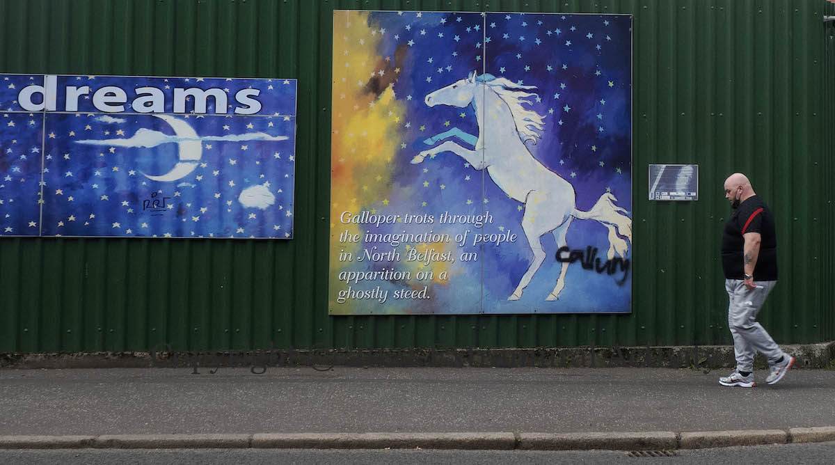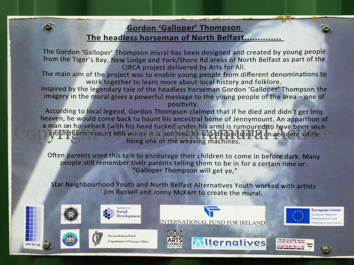 “Gordon ‘Galloper’ Thompson – the headless horseman of North Belfast …. The Gordon ‘Galloper’ Thompson mural has been designed and created by young people from the Tiger’s Bay, New Lodge and York/Shore Rd areas of North Belfast as part of the CIRCA project delivered by Arts for All. … According to local legend, Gordon Thompson claimed that if he died and didn’t get into heaven, he would come back to haunt his ancestral home of Jennymount. An apparition of a man on horseback (with his head tucked under his arm) is rumoured to have been seen around Jennymount Mill where it is believed he was decapitated in an accident while fixing one of the weaving machines. Often parents used this tale to encourage their children to come in before dark. Many people still remember their parents telling them to be in for a certain time or: “Galloper Thompson will get ye.” ” (The text is from Joe Baker’s Haunted Belfast. More info from Walking Tours Belfast.)