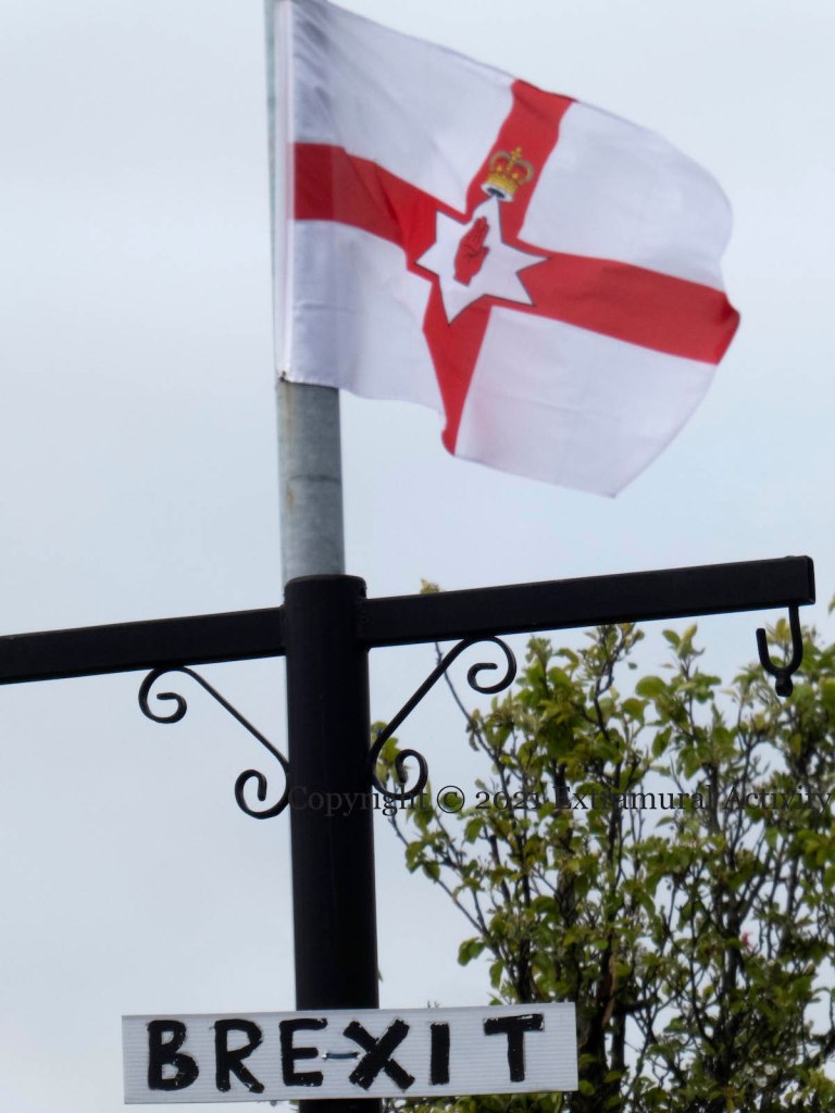 The Ulster Banner flies at the bottom of the Limestone Road above a (new but possibly pre-dating the NI Protocol) hand-made ‘Brexit’ sign.