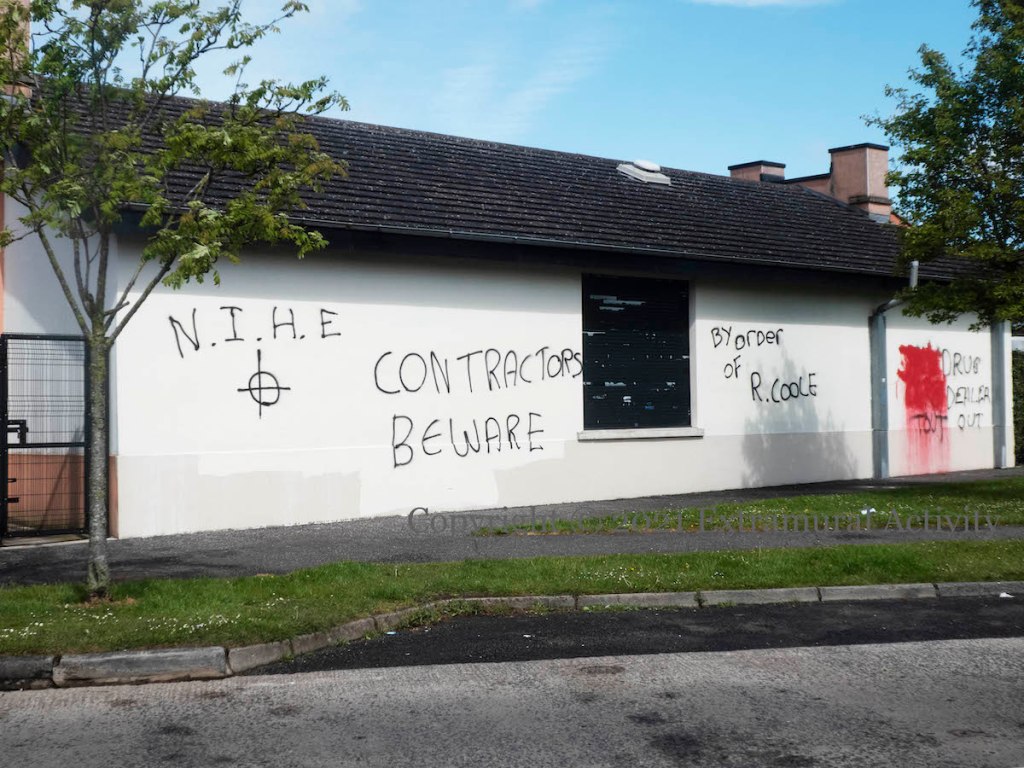 “By order of R. Coole.” Two of the Rathcoole towers have been scheduled for demolition by the NIHE, beginning with Monkscoole House this summer, to be followed later by Abbottscoole House. In their place, 50 homes will be built, about half as many as currently reside in the two blocks; this has led to graffiti in the estate protesting the plan (Newtownabbey Times one | two).