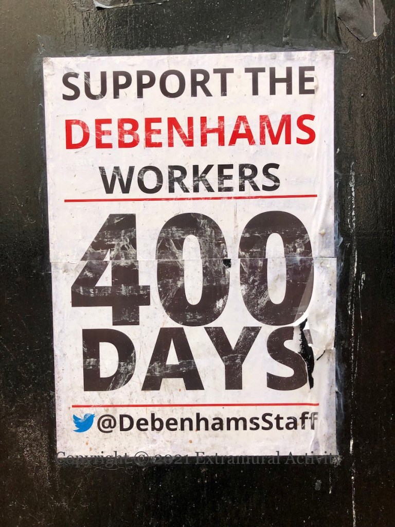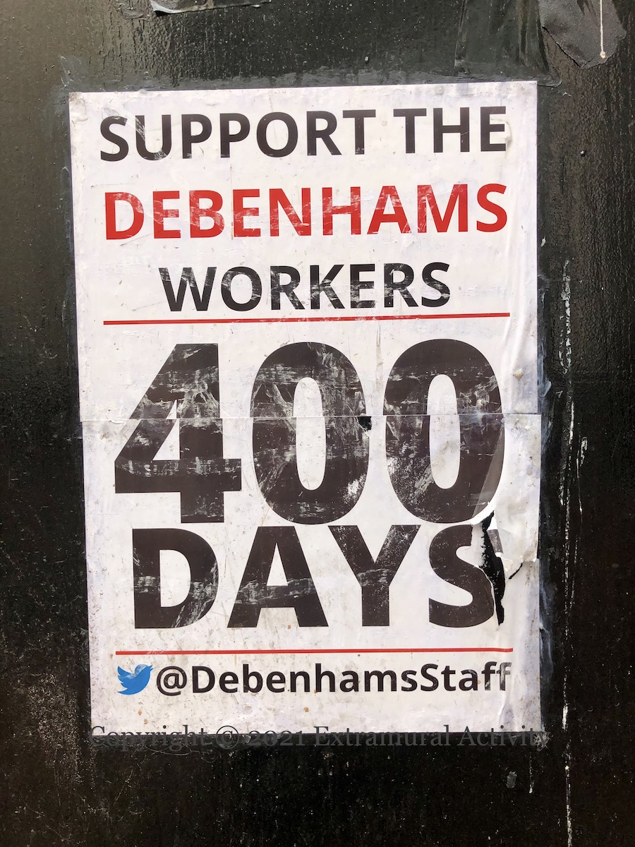 Debenhams went into administration on April 9th, 2020 and immediately announced the closure of their stores in the Republic, with the loss of 1,200+ jobs. Workers went on strike for their union-negotiated redundancy, picketing both the front and rear entrances of stores to prevent the removal of stock by liquidators. The strike ended after 406 days when workers voted to accept an (Irish) government re-training scheme of 3m euro (Irish Times); the company was liquidated and all stores closed, including those in the north. The poster shown is on the ILAC centre in central Dublin.