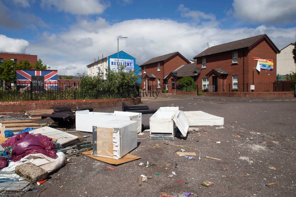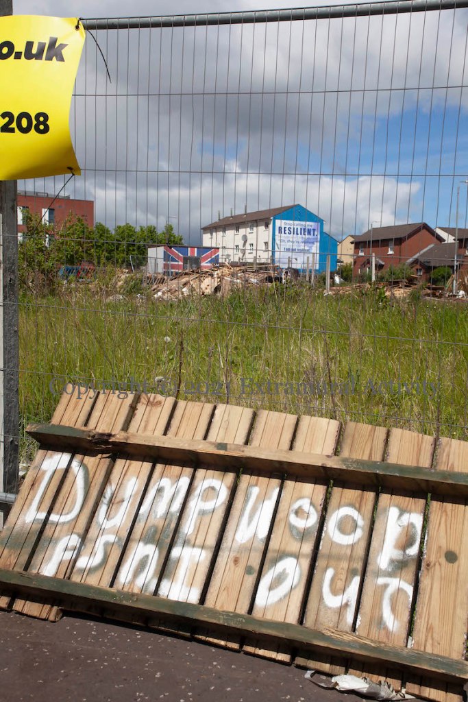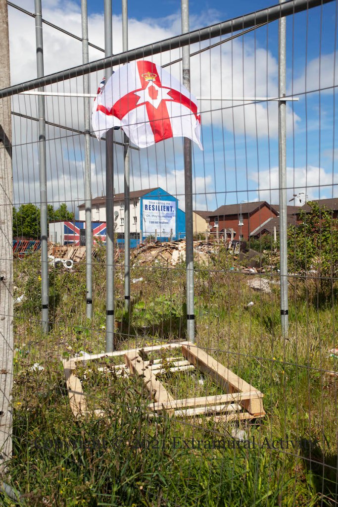 The sign reads “Dump wood – PSNI out”; the Ulster Banner flies to mark the boundary; guardians keep warm around a fire; old fridges and furniture lie among the pallets. The signs are unmistakable: collection for Eleventh Night 2021 is under way in the lower Shankill.