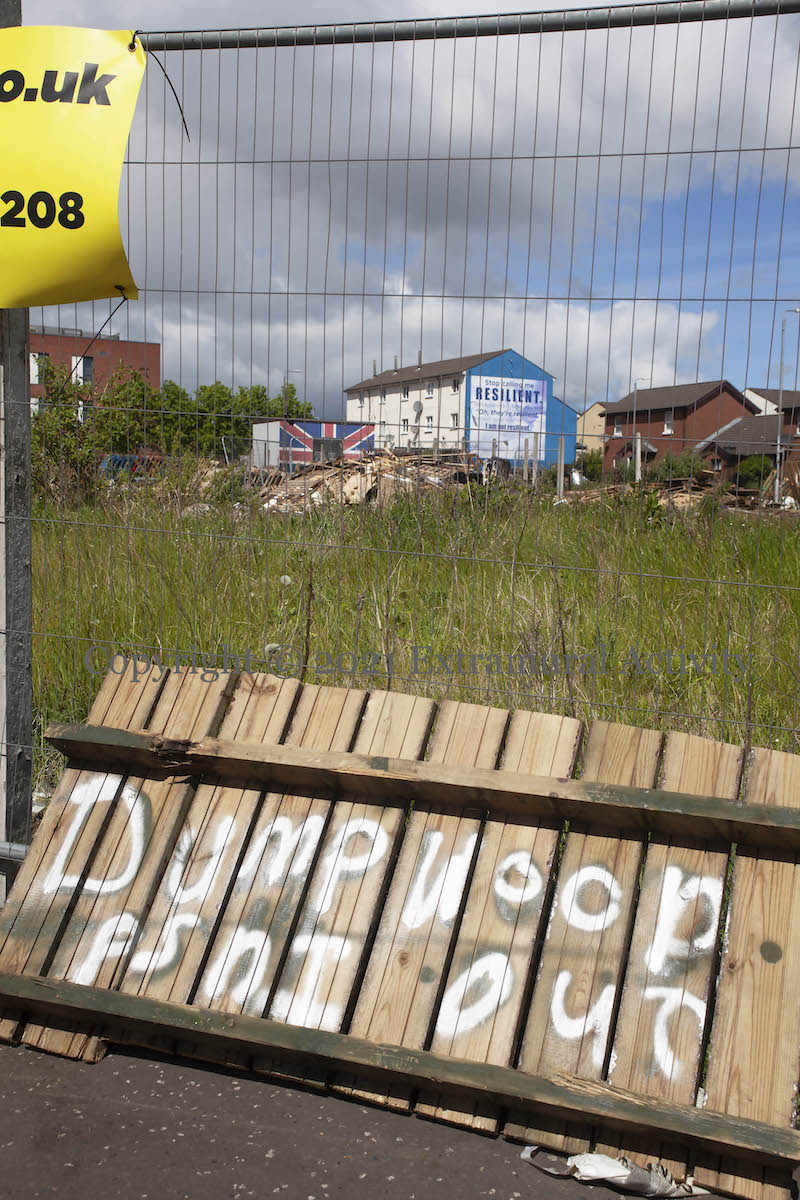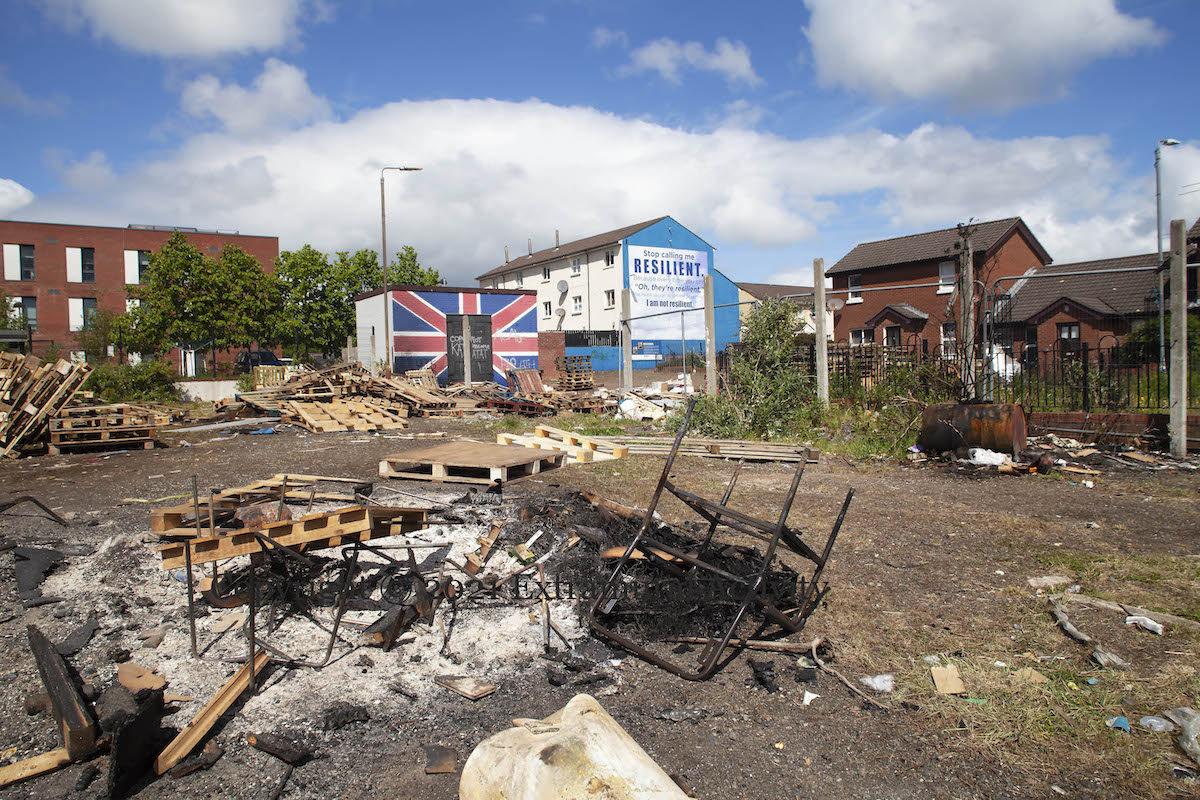 The sign reads “Dump wood – PSNI out”; the Ulster Banner flies to mark the boundary; guardians keep warm around a fire; old fridges and furniture lie among the pallets. The signs are unmistakable: collection for Eleventh Night 2021 is under way in the lower Shankill.
