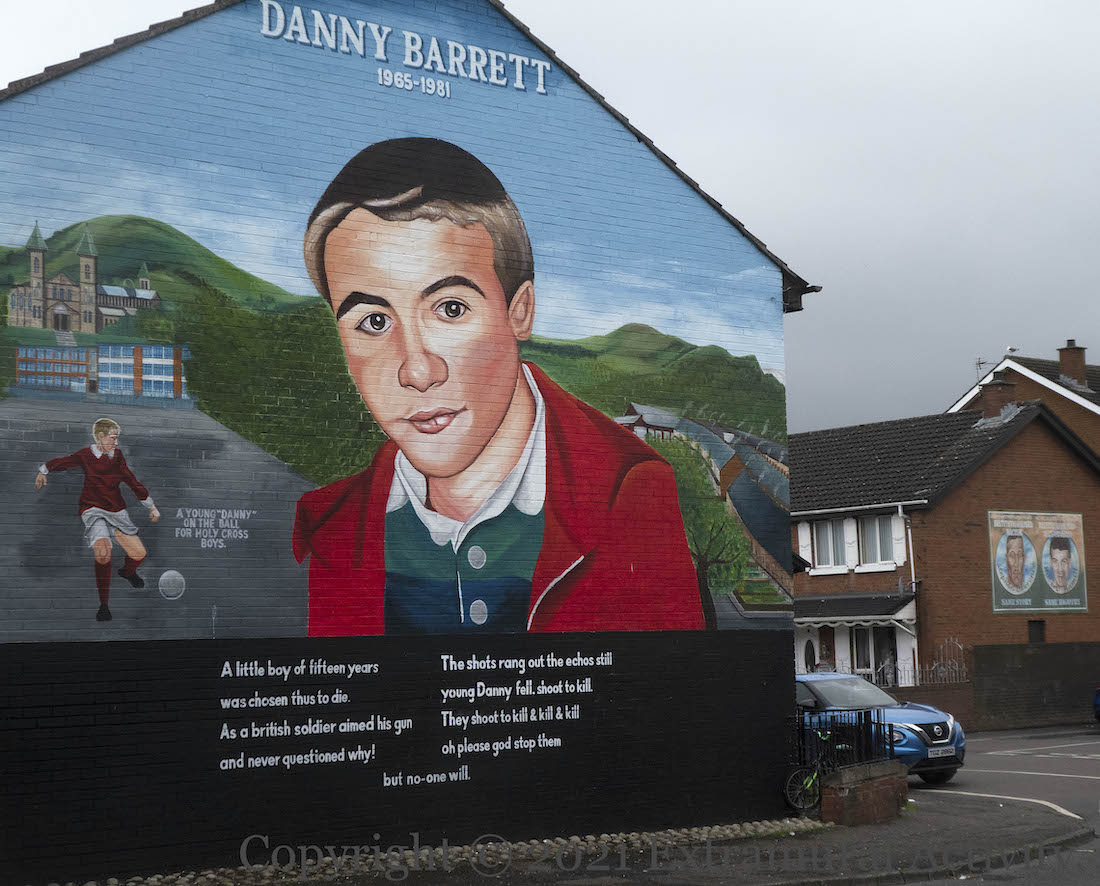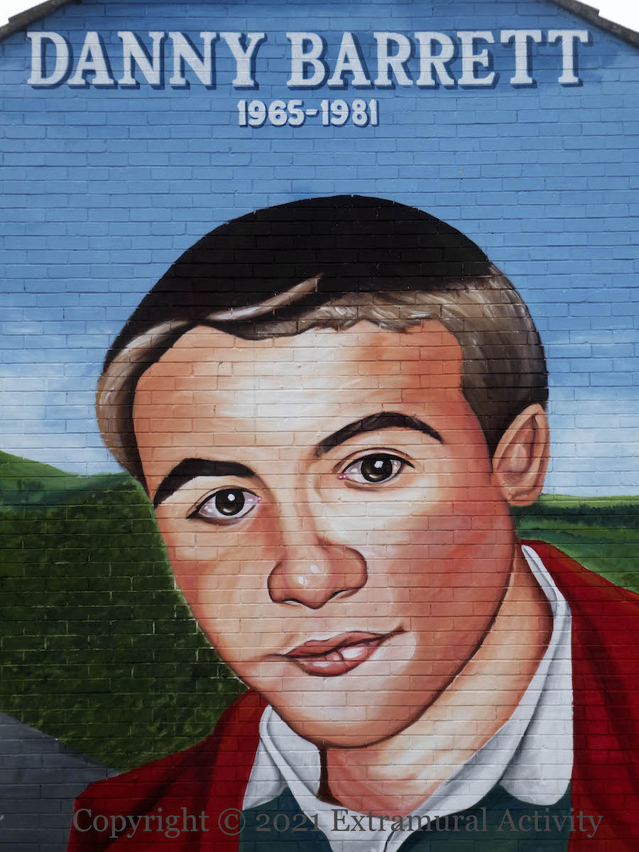 “A little boy of fifteen years/was chosen thus to die./As a British soldier aimed his gun/And never questioned why!/The shots rang out, the echo[e]s still/Young Danny fell, shoot to kill./They shoot to kill & kill & kill/Oh please God stop them/But no one will.” Danny Barrett was shot and killed on July 9th, 1981 – a day after Joe McDonnell’s death and on evening of the same day as the shooting of Norah McCabe – by a single shot from a British army observation post on top of Ewart’s Mill. The mural in his memory is in Havana Way, close to his Havana Court home, where he had been sitting on a garden wall talking to a friend. For a full account, see Free Ireland or watch video of his sisters in front of the new mural. For the Lawrence/Hammil board in Brompton Road, see Same Story, Same Bigotry.