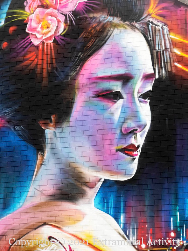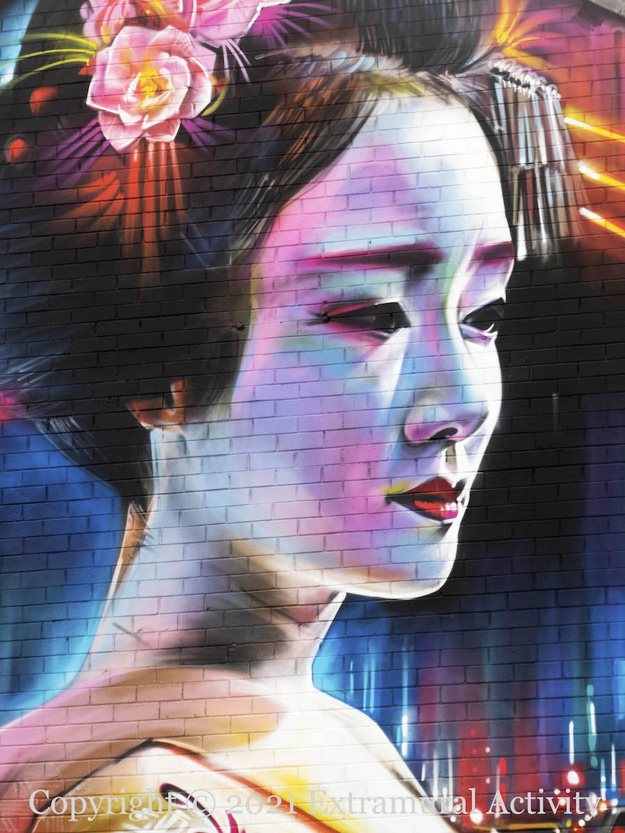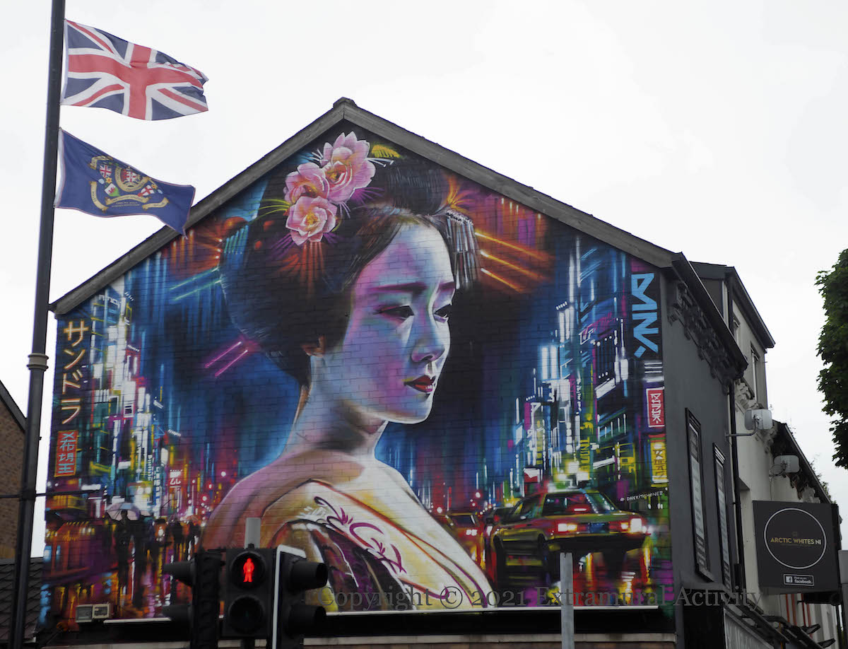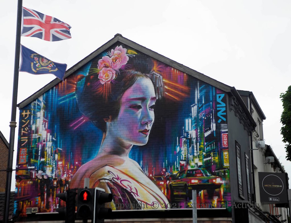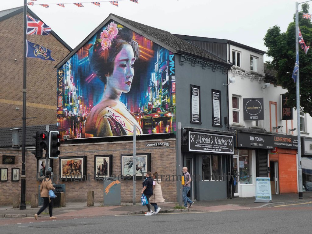 Both murals feature Tokyo landscapes (as is the case with Dan’s work) but a geisha is featured here rather than a familiar black taxi. “The wall is dedicated to Sandra- サンドラ. Sandra McCurry worked and owned Mikala’s Kitchen on The Shankill Road, Sandra worked tirelessly for the local community and sadly passed away” (Belfast Walking Tours Fb).