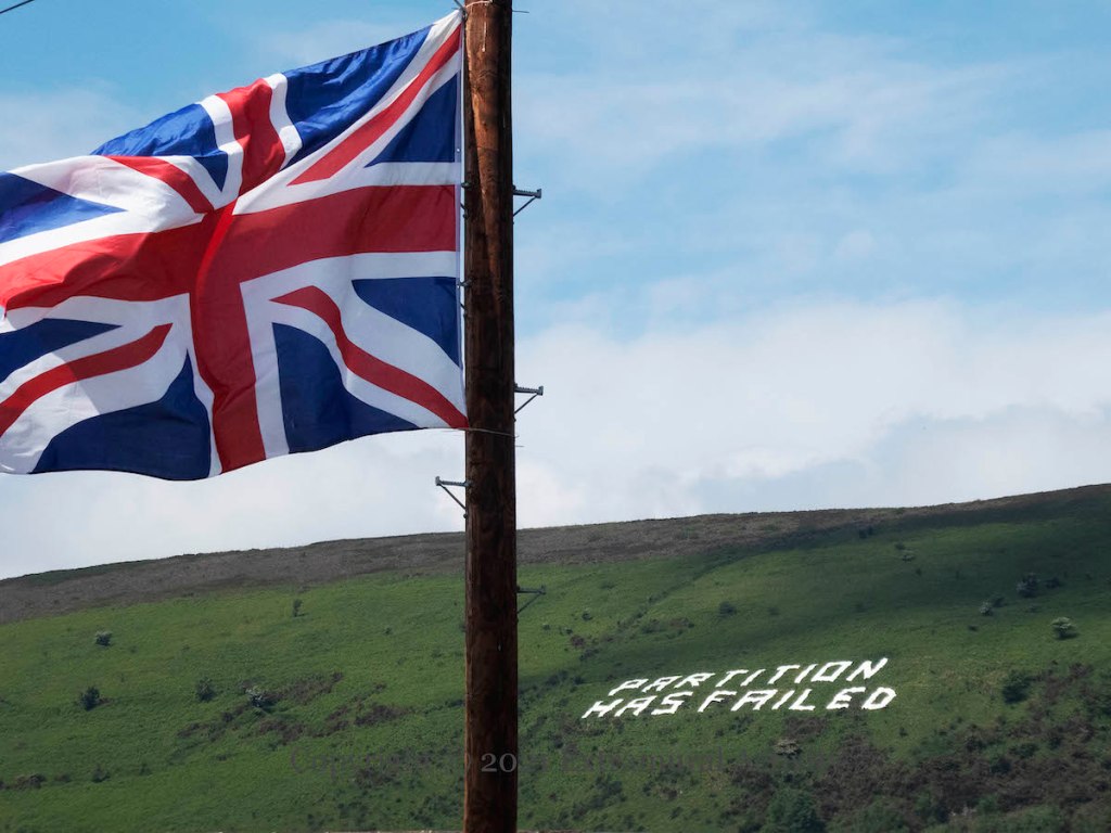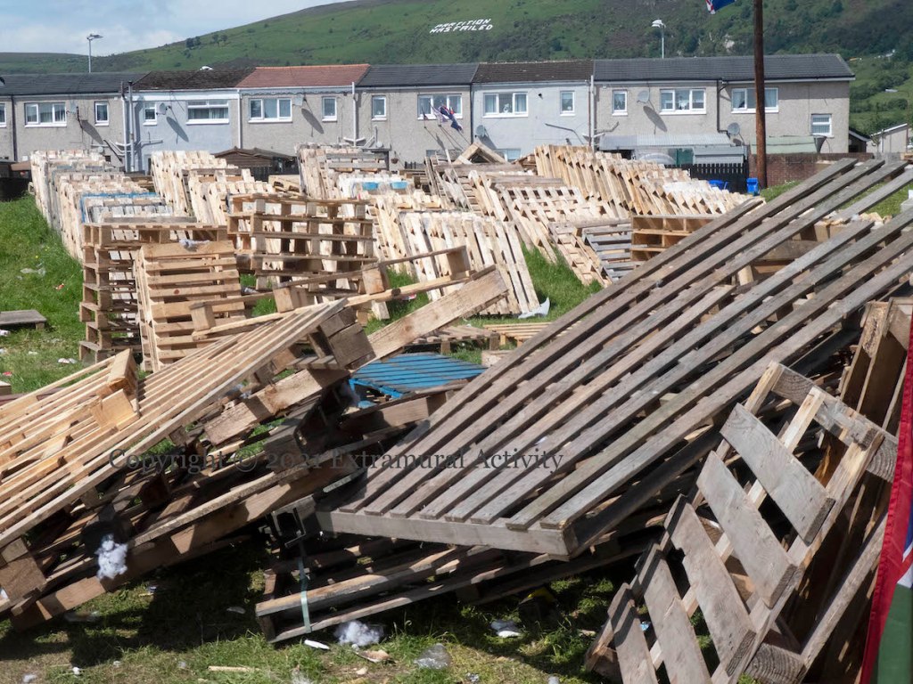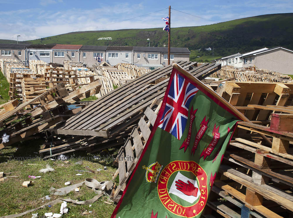 On June 22nd, 1921, the parliament of Northern Ireland was opened by George V at Belfast’s City Hall. In his address to the assembled dignitaries, he said “I have … come in person, as the head of the Empire, to inaugurate this parliament on Irish soil. I inaugurate it with deep felt hope and I feel assured that you will do your utmost to make it an instrument of happiness and good government for all parts of the community which you represent. This is a great and critical occasion in the history of the Six Counties … I pray that My coming to Ireland to-day may prove to be the first step towards an end of strife amongst [Ireland’s] people, whatever their race or creed.” “Partition has failed” to answer his prayer. Above: the latest message on Slıabh Dubh; below: the mountain from the bonfire pallets collected on the Highfield estate.