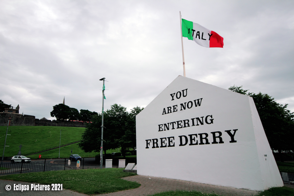England play Italy this evening in the final match of Euro “2020” (delayed for a year due to the coronavirus pandemic). Bogside residents have hung out the Tricolour … of Italy … over Free Derry Corner to indicate their support; the word “Italy” is included to dispel any potential confusion with the Irish tricolour.