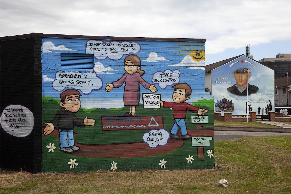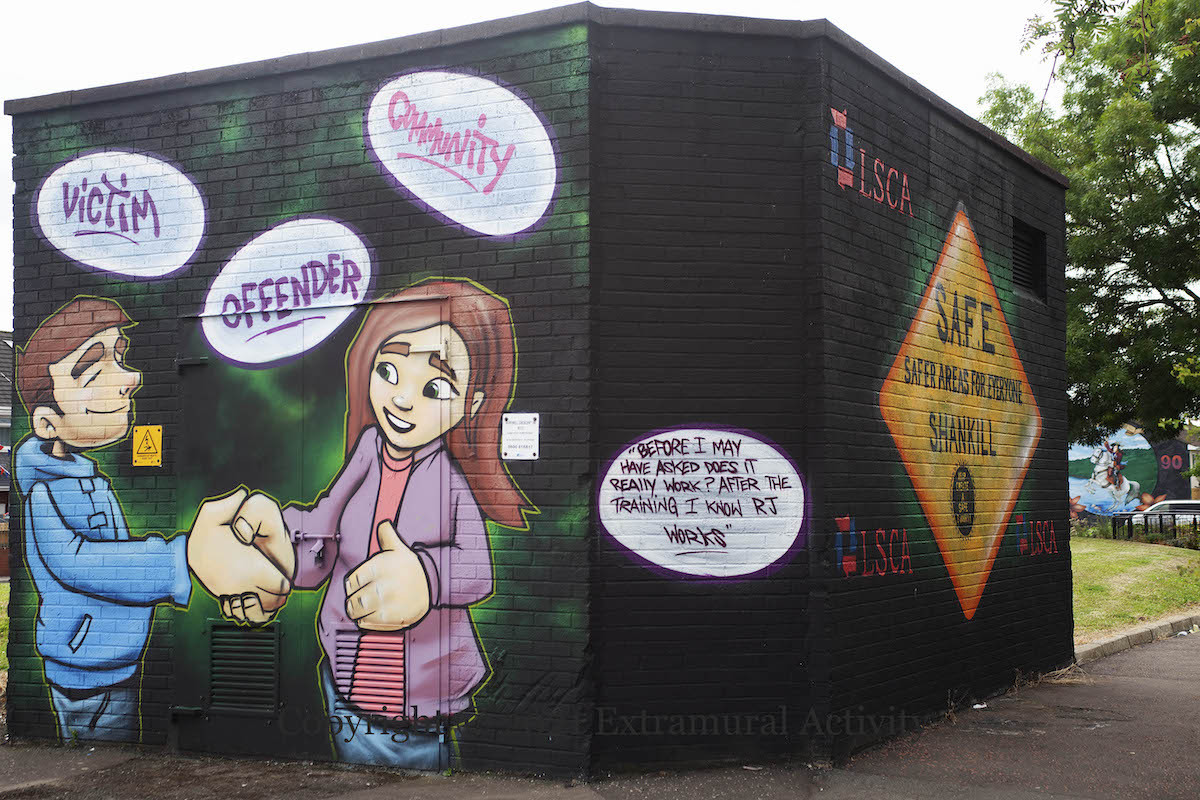 The Consensus ‘Community Restorative Justice/Mediation’ programme (tw) attempts to resolve threats, disputes, and conflicts over anti-social behavior, hate crimes, interface violence, and paramilitary threats in the lower Shankill. With support from the Lower Shankill Community Association (tw) and the SAFE programme.