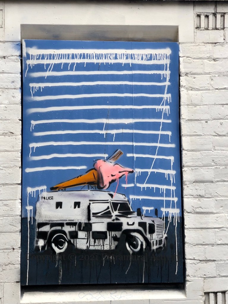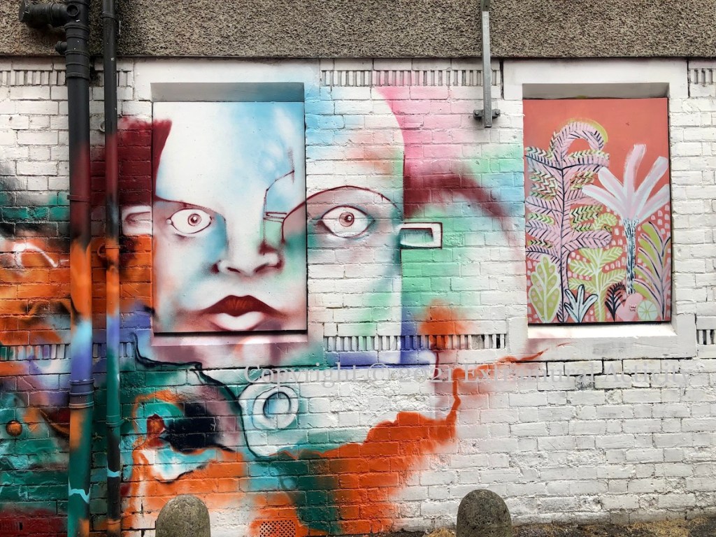A variation on Leo Boyd’s (web) Freshly Made For You! (and Winding Up The Peelers) outside Artcetera (web | ig | Fb) (formerly the Red Barn Gallery) off Rosemary Street, Belfast, with two other pieces by unknown artists (replacing Turning Towards The Sun). (The trio is soon joined by Wee Nuls’s Medusa.)