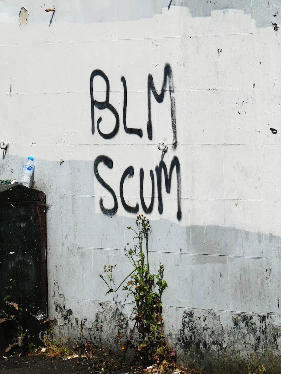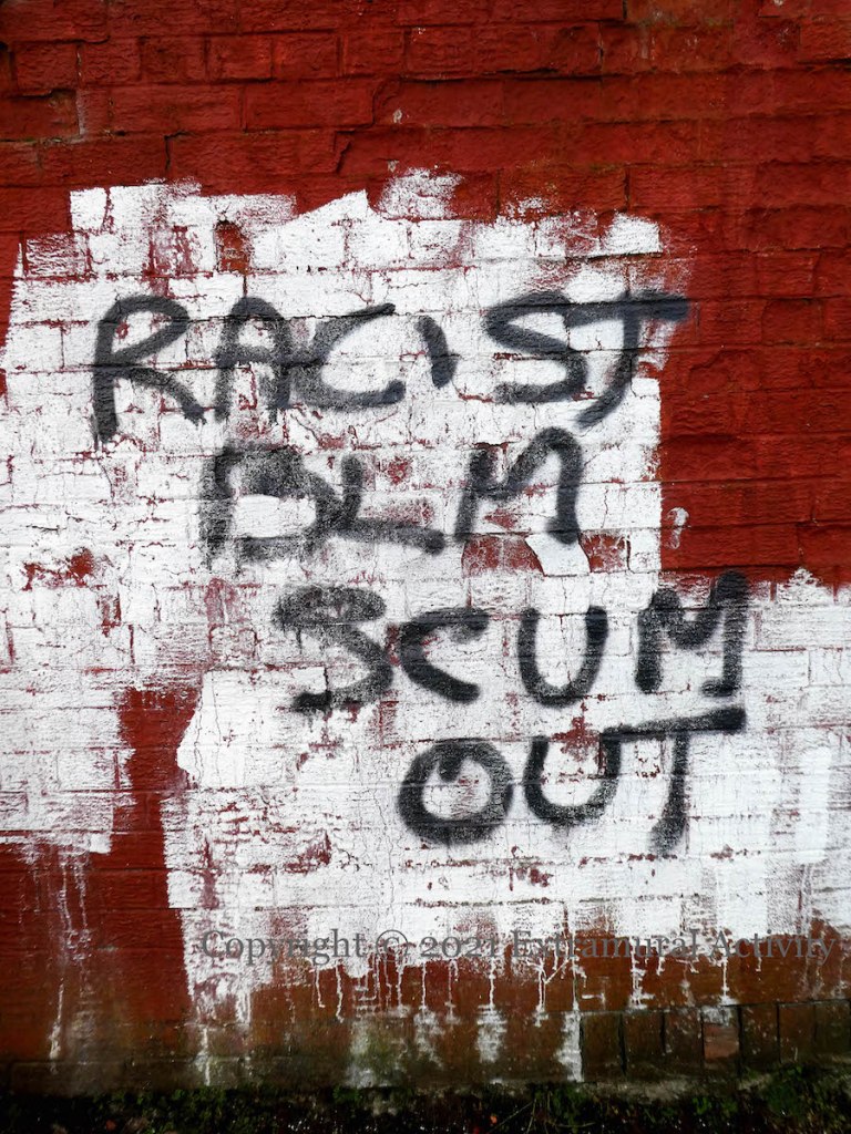 The height of anti-BLM sentiment came last year (2020) when the statue of Winston Churchill in London’s Parliament Square was vandalised and boarded up for protection, lest it suffer the same fate as the statue of Edward Colston in Bristol (iNews | NYTimes) met at the hands of protestors marching in response to the death of George Floyd in Minneapolis, USA (for CNR support for see An Injustice To One Is An Injustice To All | You Cannot Put A Knee Upon The Neck Of An Idea | Here To Stay | Black Lives Matter). The graffiti in the Woodvale (below) is from 2021, however. The graffiti above is in the Highfield area.