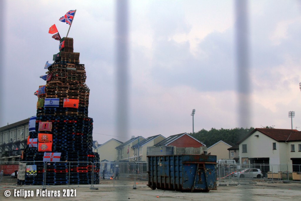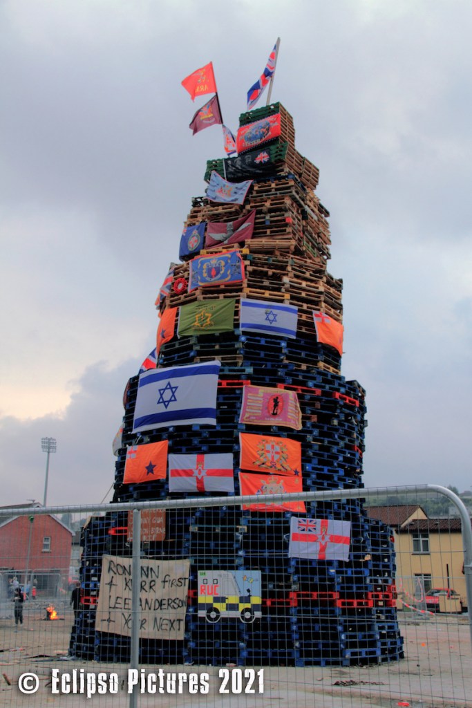 Before it was lit the banner in the lower left of the image above – “Ronann [sic] Kerr first, Lee Anderson your [sic] next” – was removed; the other flags and banners remained (BBC). The banner had drawn criticism as Kerr, a Catholic PSNI officer, was killed by a car bomb just north of Omagh in 2011 (BBC | BelTel).