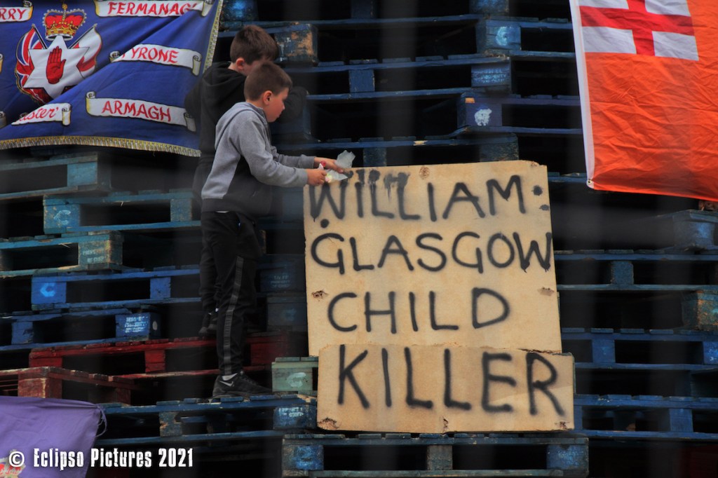 William Glasgow – see the image below – was the British Army soldier who shot and killed 15-year old Manus Deery in 1972 near the spot of the bonfire. His killing was ruled “unjustified” in 2017 (Irish Times); Glasgow died in 2001 (BBC). There are two plaques to Deery’s memory and he is included in the mural The Runner.