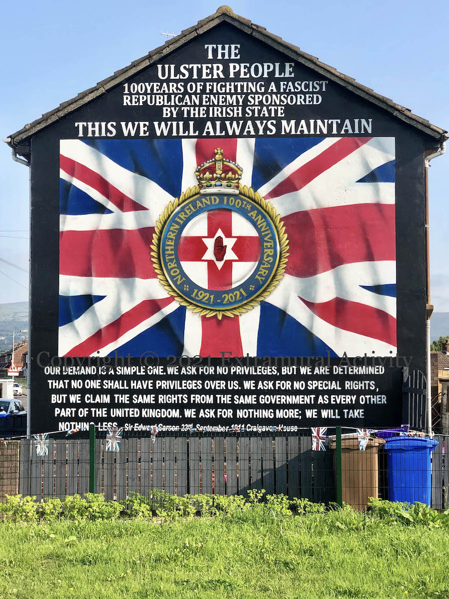 An estimated 100,000 people congregated at Craigavon House on the 23rd of September, 1911, to hear Edward Carson’s inaugural speech as Unionist leader (McNeill Ch. 4). In his speech he said “Our demand is a simple one. We ask for no privileges, but we are determined that no one shall have privileges over us. We ask for no special rights, but we claim the same rights from the same government as every other part of the United Kingdom. We ask for nothing more; we will take nothing less”. Ten years later, in 1921, Northern Ireland was created and it has survived to reach its centenary, despite (according to this mural) “100 years of fighting a fascist republican enemy sponsored by the Irish state.”
