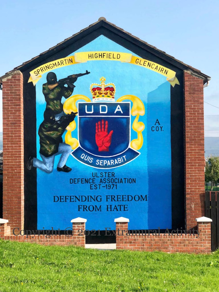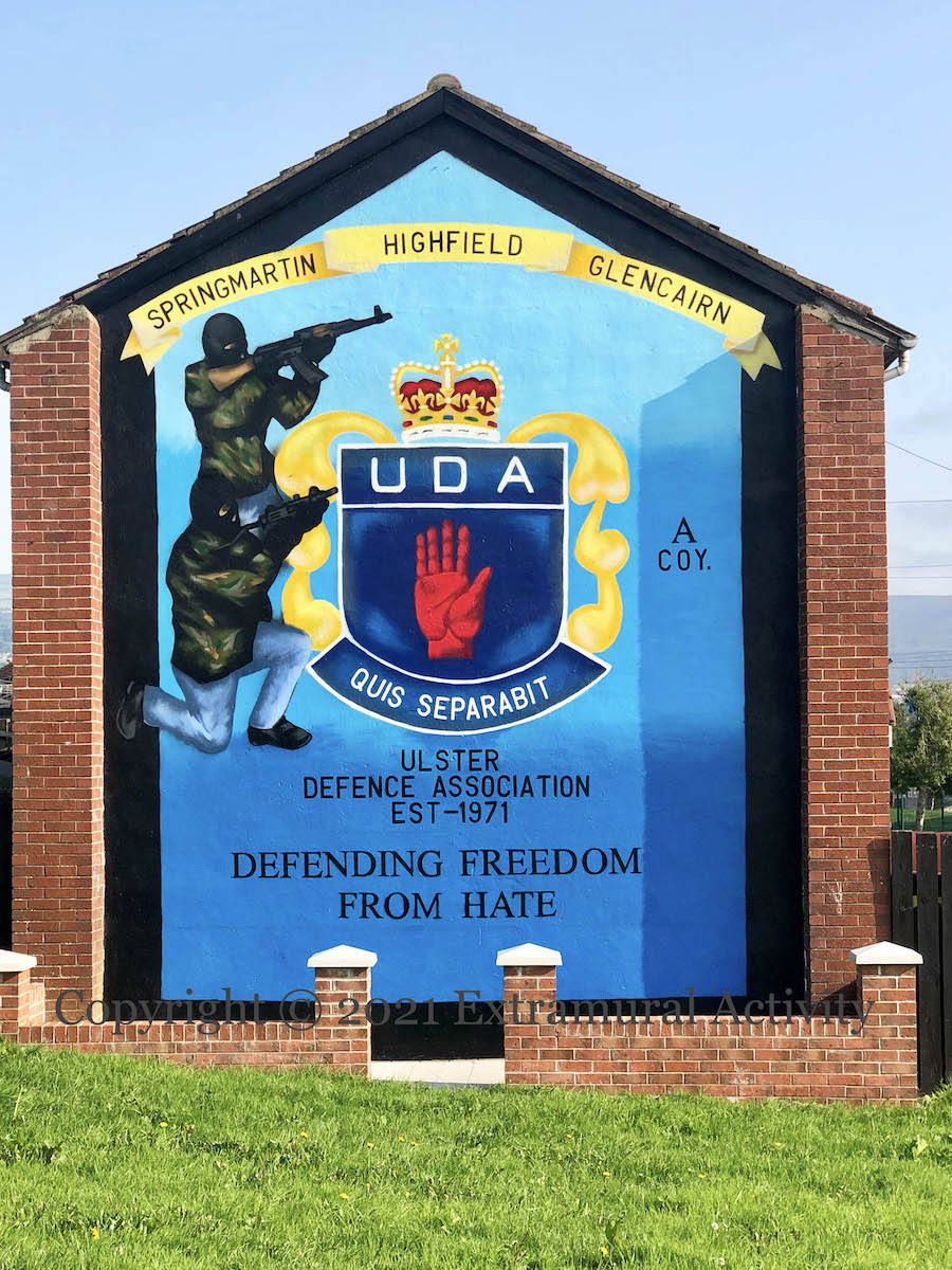 Compared to the UVF, the UDA more strongly detect an existential threat to loyalism and evince a siege mentality that provokes the need for armed resistance. Hence the more frequent presence of armed gunmen in UDA murals (which is also due in part to the UVF being able to “re-image” around the Ulster Volunteers and the Somme). With Brexit and the Protocol, however, armed gunmen have recently been appearing more frequently in UVF murals – see, for example, If Our Shores Are Threatened | Bang Up To Date | Our British Identity.