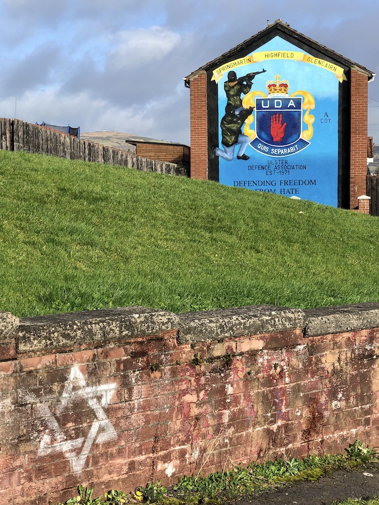 “Springmartin–Highfield–Glencairn Ulster Defence Association est. 1971. Defending freedom from hate.” As the companion mural (We Will Take Nothing Less) makes clear, the hate is coming from a “fascist republican enemy” (“Sinn Fein/IRA”, presumably) and the government of Ireland. Graphically, this mural is the same as the previous one on this wall: Under The Protection Of The UDA.