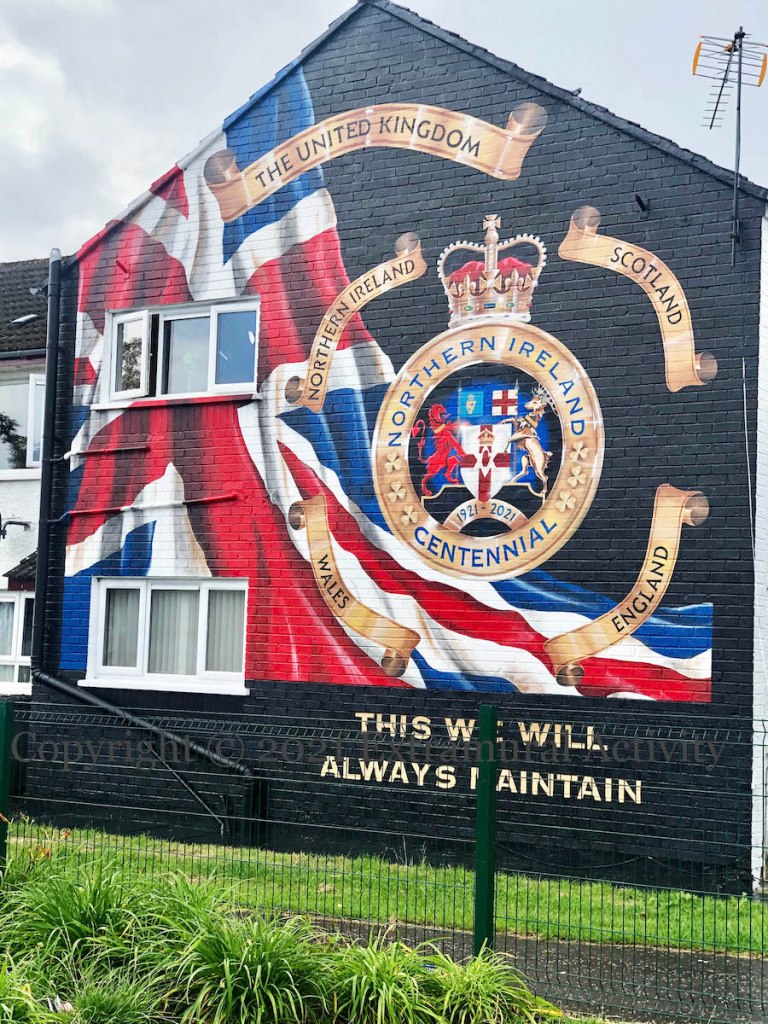 This mural celebrating the centenary of Northern Ireland’s creation, in the Woodburn estate, Carrickfergus, accurately shows the Tudor crown on the arms, as was used at the time of creation and prior to the Edwardian crown (WP).