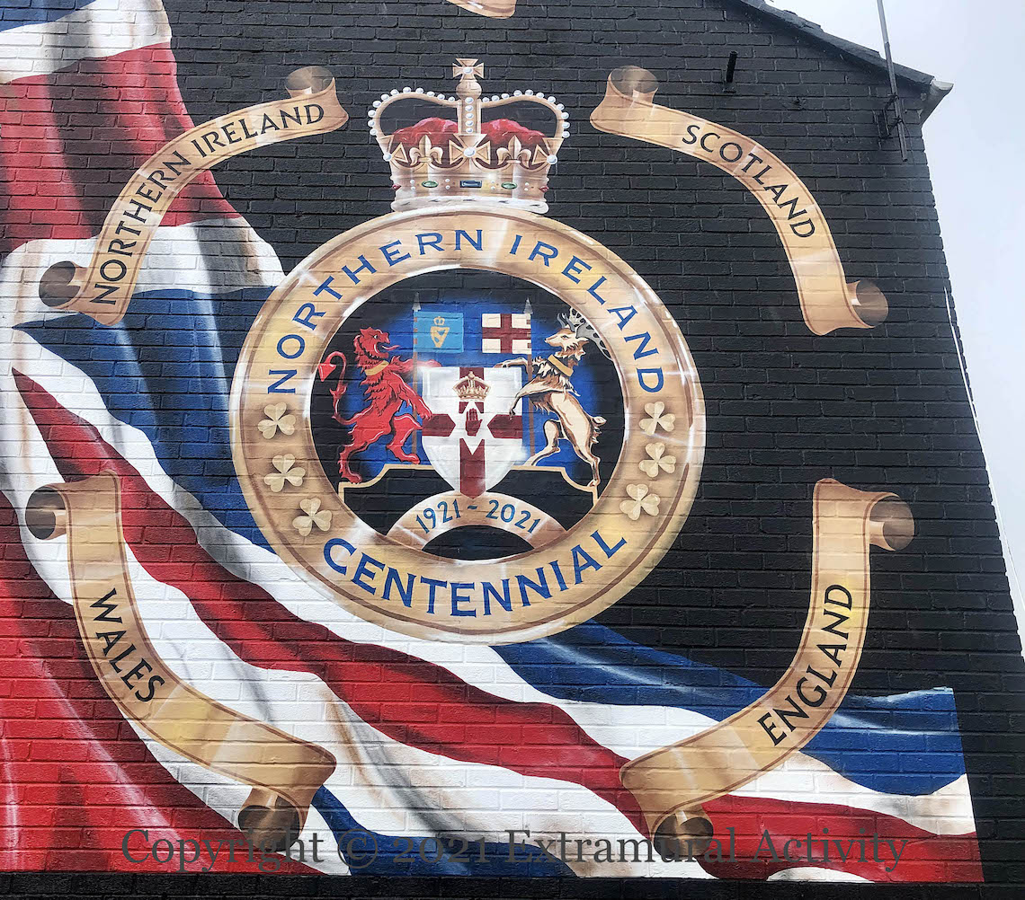 This mural celebrating the centenary of Northern Ireland’s creation, in the Woodburn estate, Carrickfergus, accurately shows the Tudor crown on the arms, as was used at the time of creation and prior to the Edwardian crown (WP).