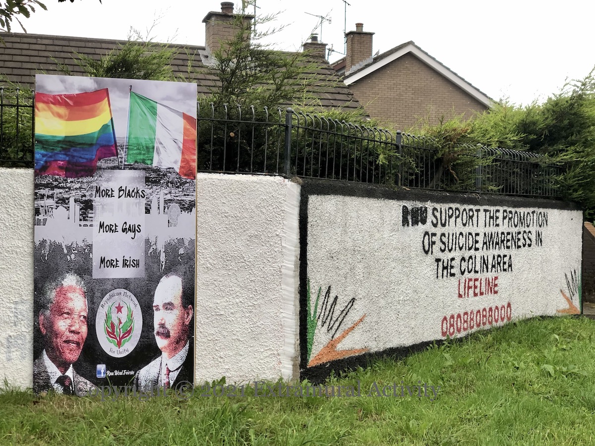 The old shop-window sign of the Irish experience in England “No blacks, no Irish, [no dogs]” is repurposed and reclaimed positively by the RNU in the Colin area, with the rainbow flag, Irish tricolour, and Nelson Mandela (alongside James Connolly) below the skyline of Belfast. For the original, see previously Oppose Racism | No Dogs, No POWs