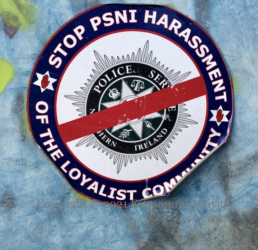 “Stop PSNI harassment of the loyalist community” The PSNI were attacked on Wednesday by youths who blocked Lanark Way (site of this sticker), following a small protest against the NI Protocol. Belfast Live ran a live-blog of the events. Police later suggested that the young people were organised by older people in the community in an attempt to increase tension over the Protocol (Belfast Live) and the threatened collapsing of Stormont by the DUP (BelTel). They were also attacked from the Springfield Road side (BelTel).