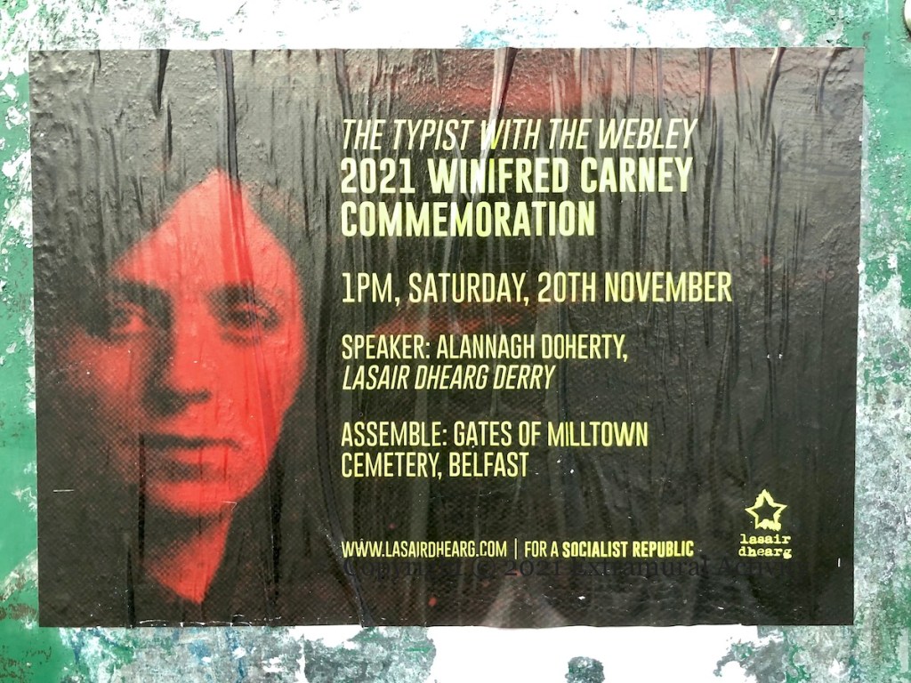 Lasaır Dhearg (web) poster for the “2021 Winifred Carney Commemoration, 1 pm, Saturday, 20th November. Speaker: Alannagh Doherty, Lasair Dhearg Derry. Assemble: Gates of Milltown Cemetery, Belfast.”
