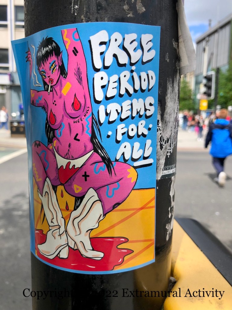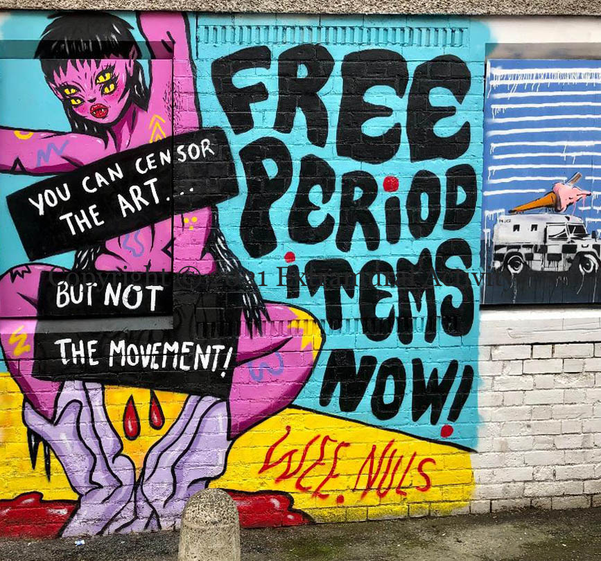 The original version of this mural by Dublin artist Wee Nuls (ig | web) was beside Transport House but it was painted over almost immediately (you can see it on Twitter). This new version, at Artcetera (formerly the Red Barn Gallery), is auto-redacted with historical commentary: “You can censor the art … but not the movement”, the movement being for “free period items” in public spaces beyond schools, spearheaded by Homeless Period Belfast. In November, 2020, Scotland became the first country in the world to offer free period products (BBC). In October of this year, Pat Catney (SDLP) in the NI Assembly introduced a ‘period poverty’ bill to expand the availability of menstrual products (BelTel); the ‘Call For Views’ period commenced on Wednesday and ends on December 18th – have your say via NIAssembly.