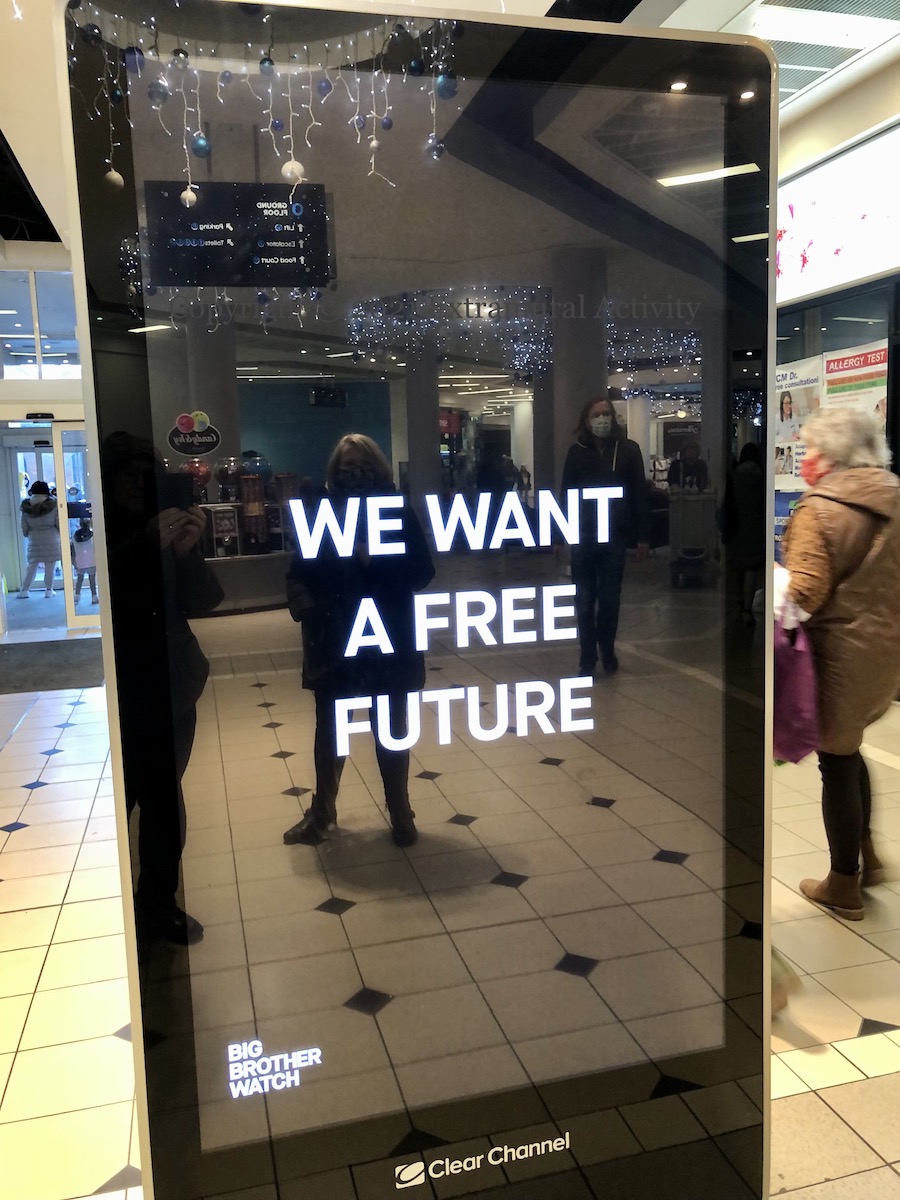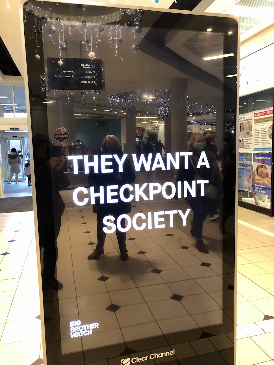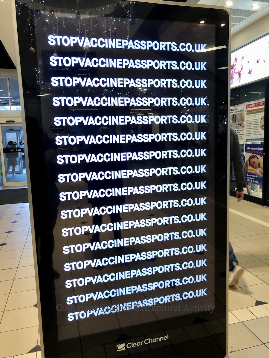 The three panels of the ad are presented here in (what is probably) the reverse of their intended order: They want a checkpoint society – We want a free future – stopvaccinepassports.co.uk.