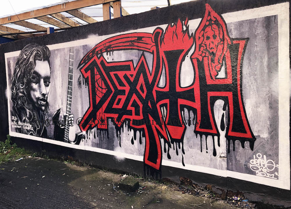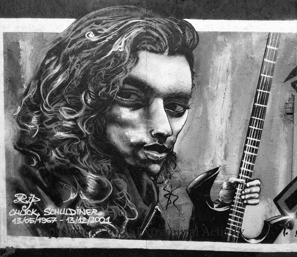 Chuck Schuldiner was the founder, vocalist, and guitarist of the metal band Death – one of the first “death metal” bands – from 1983 until his death at 34 from a brain tumour, twenty years ago today (WP). The mural in his honour is in the alley off Bloomfield Avenue, behind the former Vault HQ; it reproduces a Getty image of Schuldiner from 1995 holding a BC Rich Ignitor guitar, now out of production. Please leave a comment if you can decipher the artist’s sig.