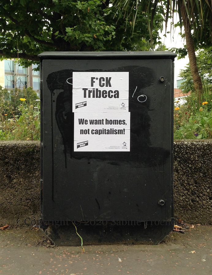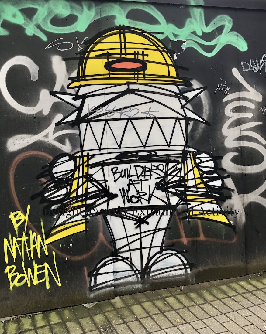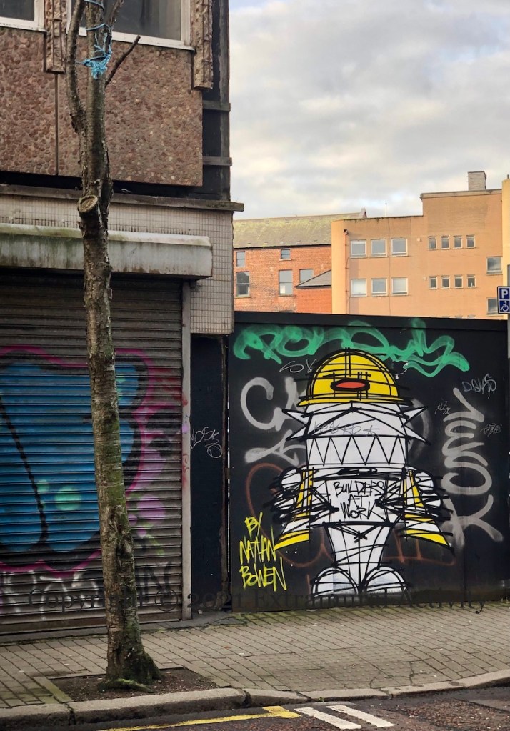 This Nathan Bowen (ig | web store) piece is on the hoarding on the west side of North Street (in front of the car-park). There is no actual construction taking place – the area has been in decline since the fire in the arcade in 2004 (see below and Condensed Community Confidence and Who Burnt Us Out?) and the Tribeca renovation has proven controversial.