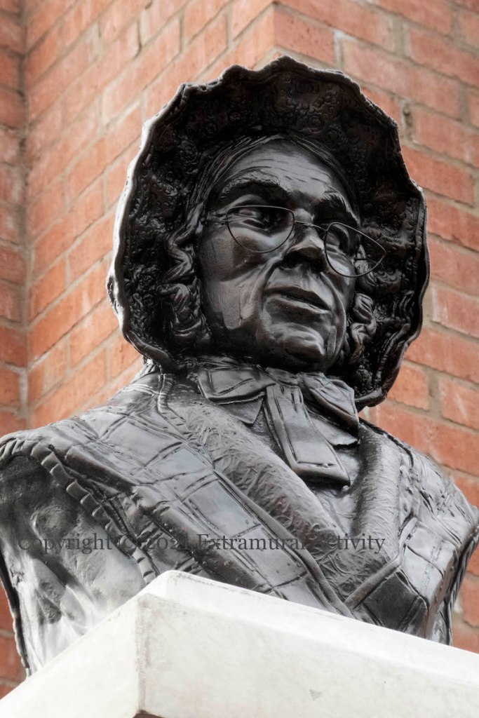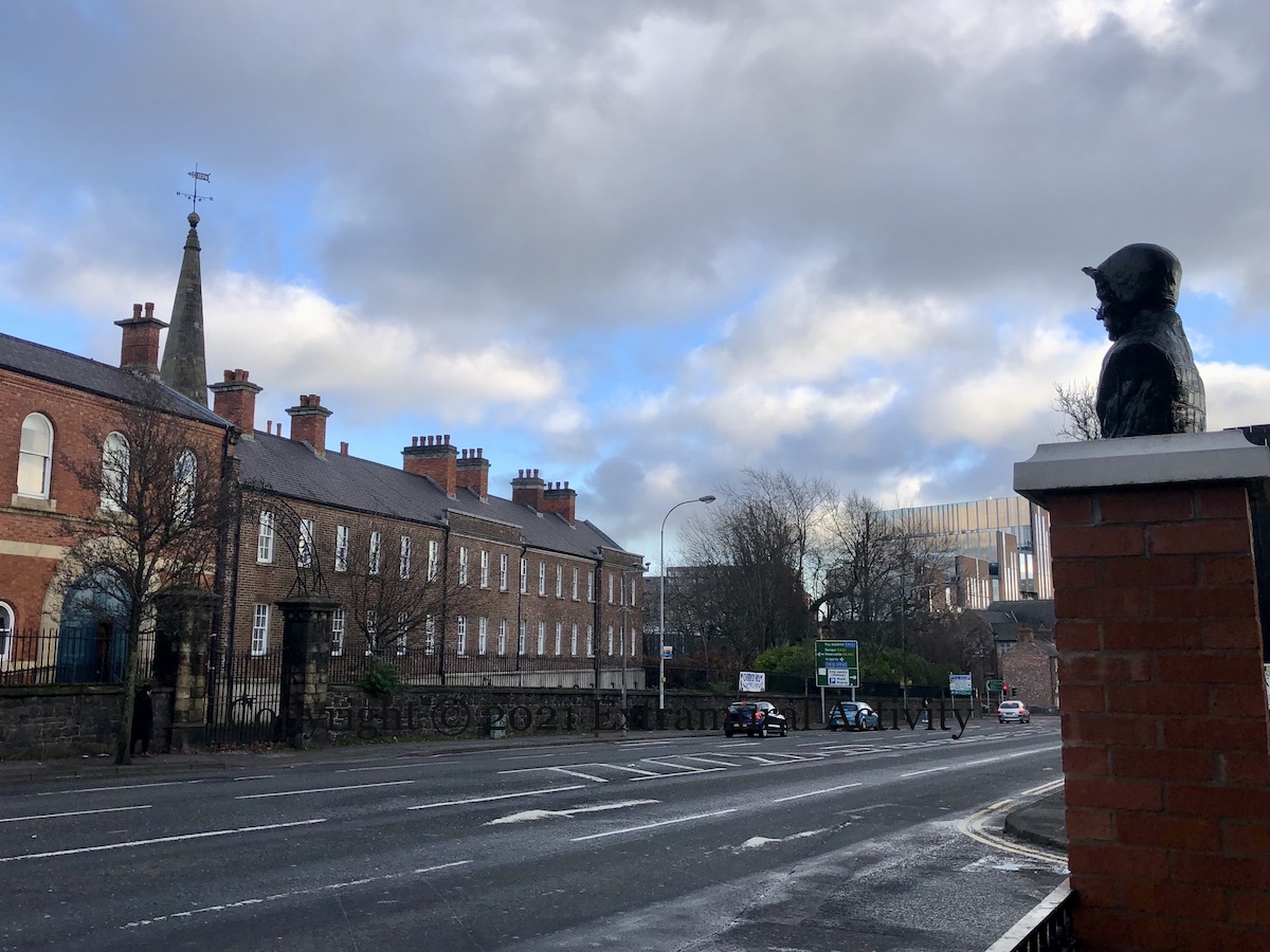 Mary Ann McCracken lived to the age of 96 (1770-1866) and over the course of that long life used her family prosperity and the success of her own muslin business to support various causes: these included the United Irishmen and her brother Henry Joy McCracken – whose illegitimate daughter Maria was taken in by Mary Ann after he was executed – and a long list of ‘social justice’ causes, including the abolition of slavery, the protection of working children, education for young children both male and female, women’s rights, and care for the destitute in Belfast – her uncles Henry and Robert had founded the Belfast Charitable Society and built a poorhouse on Clifton Street and Mary Ann served on the Ladies Committee (WP | NICVA). This new bust of Mary Ann McCracken looks towards Clifton House from Stanhope Street in Carrick Hill. (The bust was designed by Anto Brennan (Irish News), who also did the No Pasarán bust in Writer’s Square.) In the other direction, as shown below, can be seen the Divis tower block.