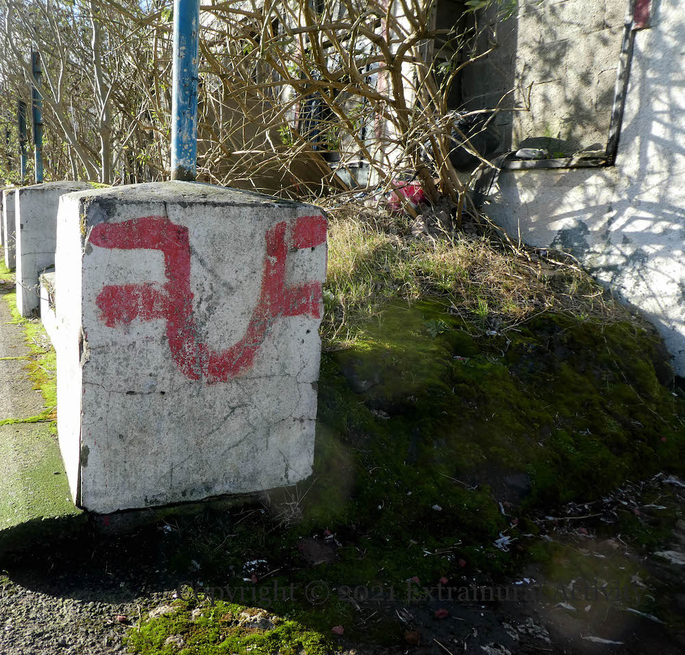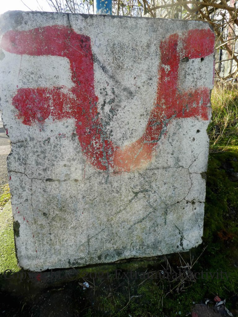 The bricked up first floor of the Tudor Lodge (formerly the Telstar) is still standing at the bottom of Gray’s Lane, with UFF graffiti that goes back a decade. For even earlier (2005) graffiti around the Tudor Lodge, see Sinn Féin Toadies.