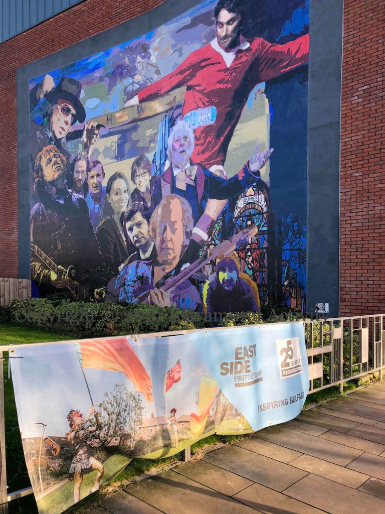 “25 years of regeneration” – 2021 was the 25th year of work in east Belfast for EastSide Partnership (web | tw). This video highlights some of their activities and projects. The tarp shown above is below the Luminaries & Legends board in Connswater Street.