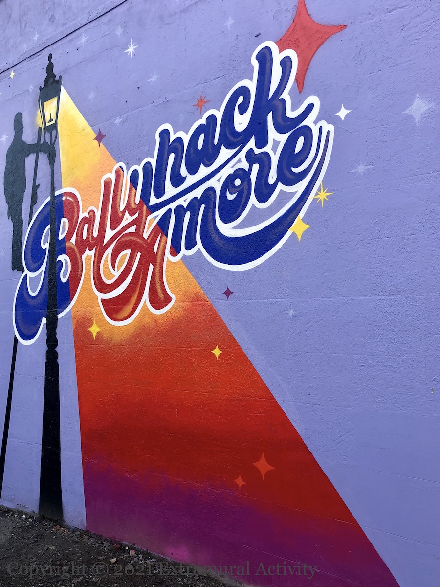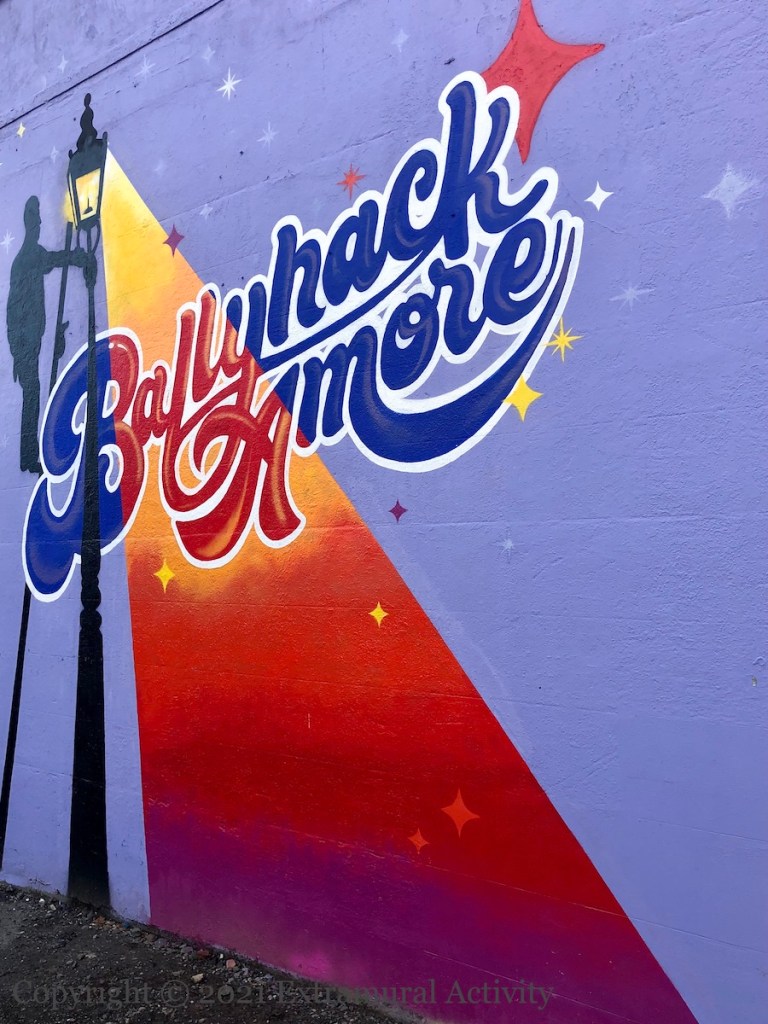 Another mural on Upper Newtownards Road on the lamplighter theme: Ballyhack-Amore by Alana McDowell (ig | web). The name “Ballyhackamore” comes not from Italian but from Irish: Baile an Chacamair, town of the mud flat (PlaceNamesNI).