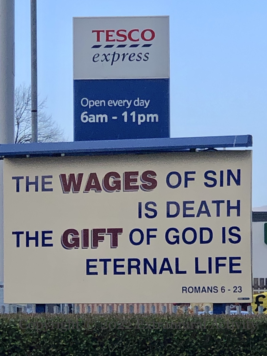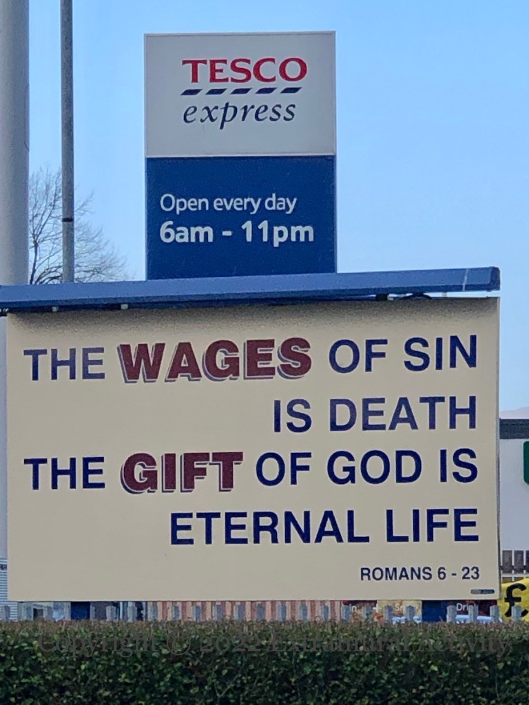 So sayeth the entablature above the entrance to Ballyhackamore Gospel Hall on the Upper Newtownards Road (which dates back to 1919). The Lord may be sought there during services on Sundays and Bible study on Tuesdays; the Tesco express next door is open seventeen hours a day, seven days a week. “The wages of sin is death, the gift of God is eternal life – Romans 6:23”