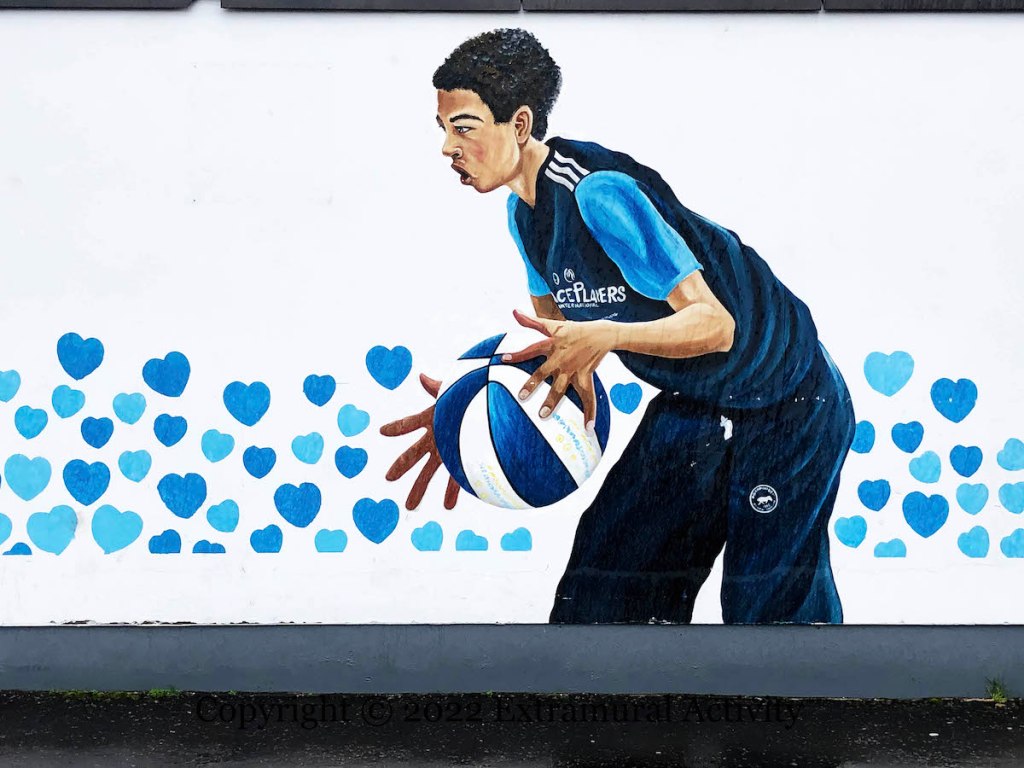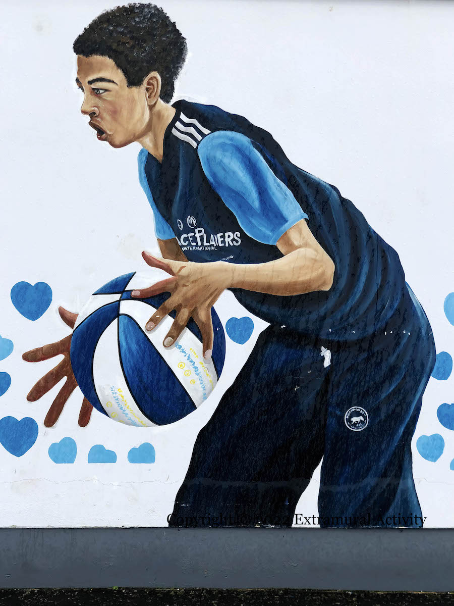 ‘Peace Players’ is an organisation that runs cross-community sporting events, including the basketball “interface league” that Noah Donohoe took part in – he is pictured here wearing his Peace Players shirt. It renamed one of its annual awards as the ‘Noah Donohoe Spirit Award’ (tw). He also played U-14 basketball at Belfast Phoenix (Fb) and the club created a scholarship in his name (Belfast Media). The mural is at the Shaftesbury rec centre in lower Ormeau.