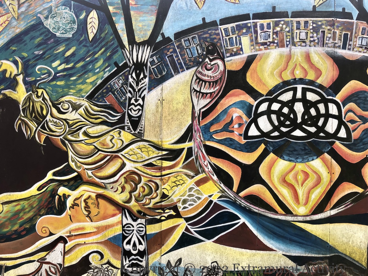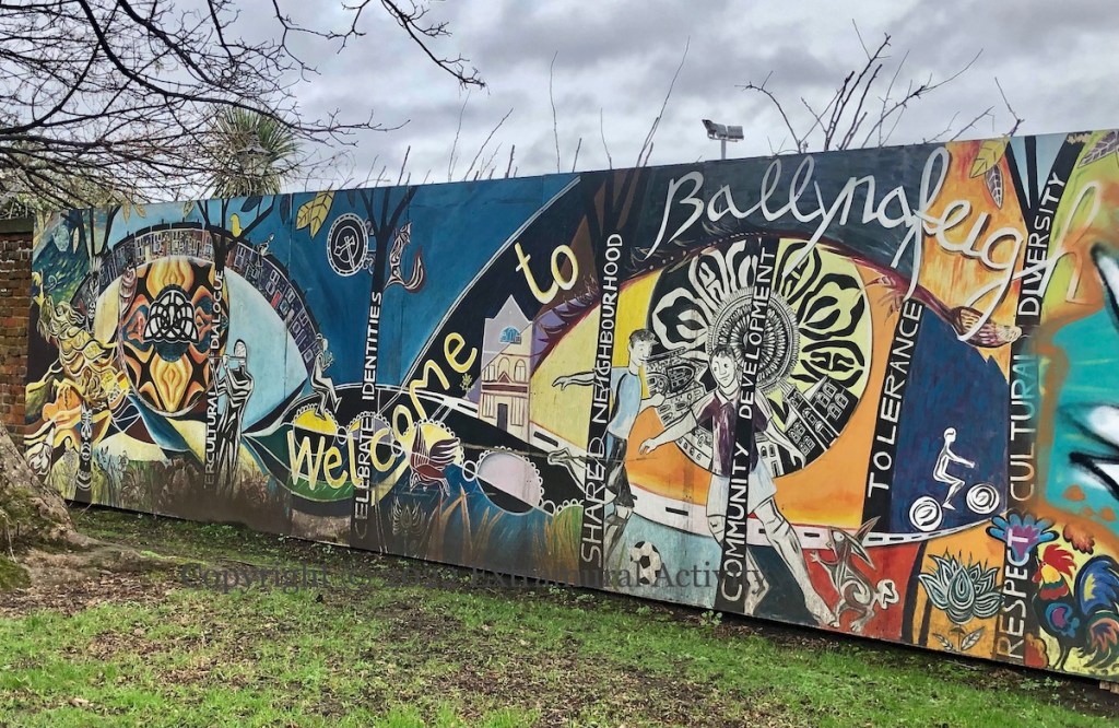 Ballynafeigh is the neighborhood just across Ormeau bridge, containing Annadale flats and surrounding streets – home to Ormeau Road UDA/UFF and Ballynafeigh Apprentice Boys flute band (Fb). The mural shown above was painted by Daniela Balmaverde (web) with help from local volunteers and presents imagery from non-Western cultures along with slogans on tree-trunks: “Cultural dialogue”, “Celebrate identities”, Shared neighbourhood”, “Community development”, “Tolerance”, and “Respect cultural diversity”. Welcome to Ballynafeigh.