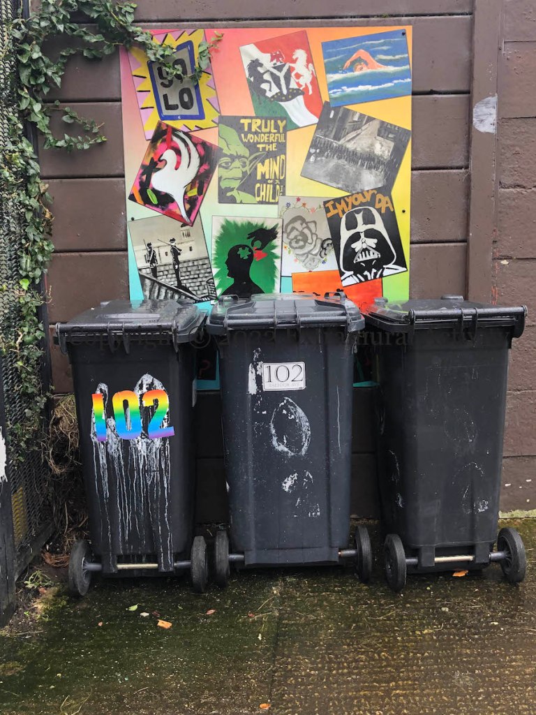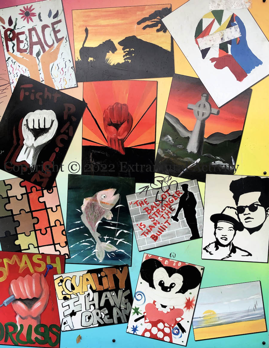 LORAG [Lower Ormeau Residents Action Group Fb | web] is a community development organisation based in the Shaftesbury rec centre. They organise various sport and fitness activities (including the Ormeau parkrun) and a programme for youth. In the boards shown here, local youngsters draw what’s on their mind, including Star Wars The Empire Strikes Back (“I’m your da”) and Attack Of The Clones “Truly wonderful the mind of a child is”!