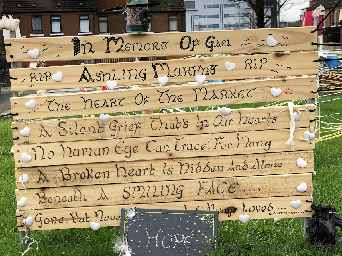 Ashling Murphy, the County Offaly schoolteacher who was killed while jogging, was a member of Ceoltas Ceoltóirí Éireann, playing fiddle and concertina (Ceoltas). Her death provoked an outpouring of grief and anger across the island, and beyond, including in the Markets, where she was remembered as a fellow Gael. The verse is a popular one from cards and social media – A silent grief that’s in our hearts, no human eye can trace. For many a broken heart is hidden beneath a smiling face – modified slightly to read “hidden and alone“.