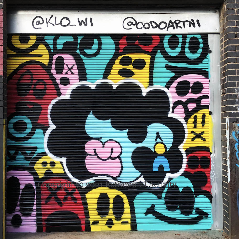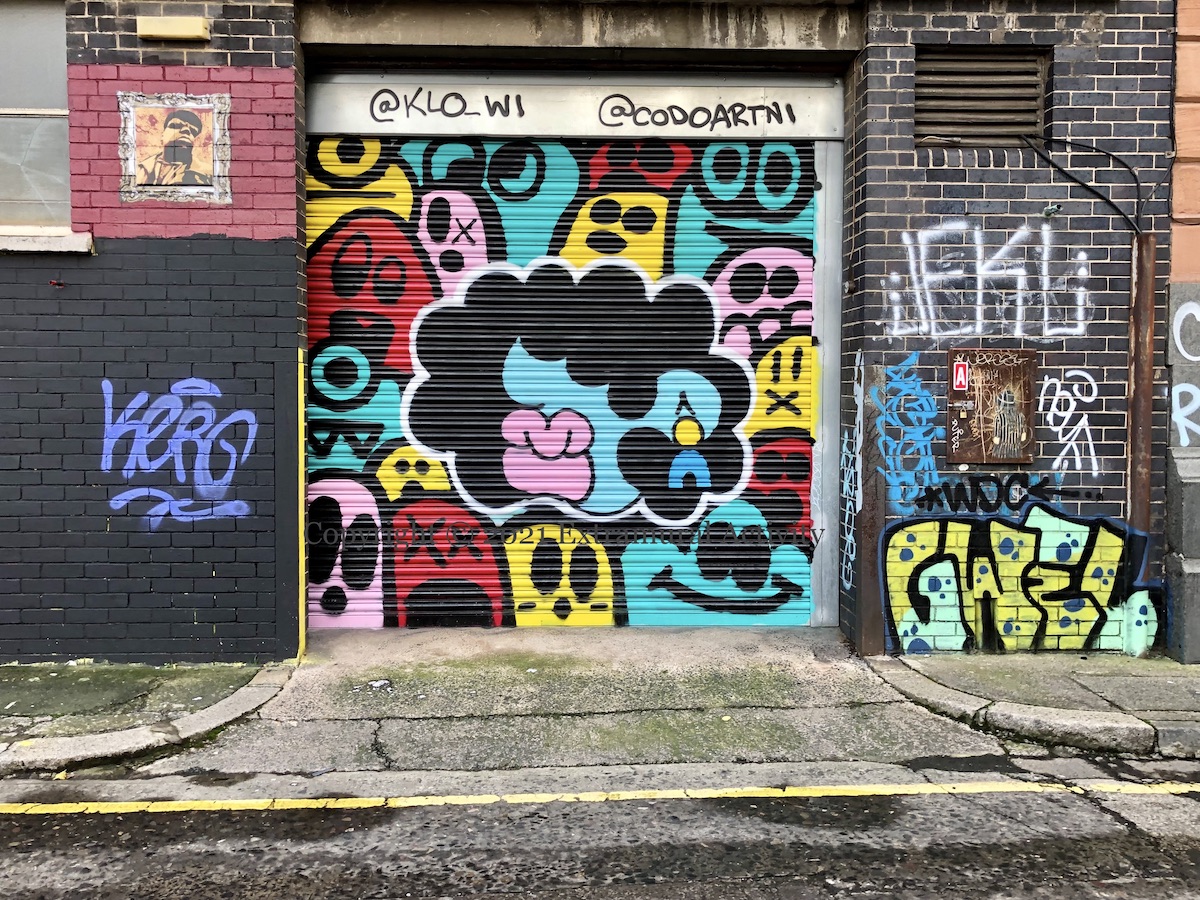 This is a HTN2021 mash-up involving KloWi (ig) and Codo (ig) in Kent Street. Codo also did a piece on the “peace” line (see Crowded Together). On the left is a portrait of Biggie Smalls by KRS-One (see Only Love Can Save Us); on the right is a small piece by Alice Pasquini (see Float).