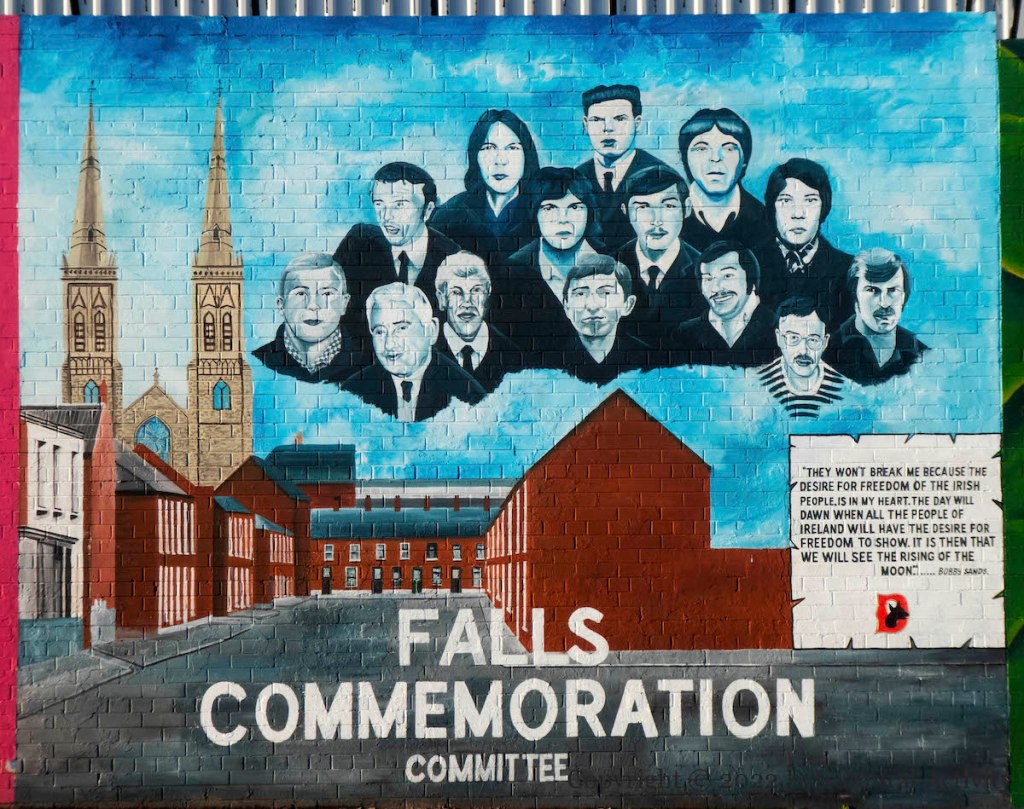A D Company “dogs” (Belfast Brigage IRA) emblem has been added to the Falls Commemoration Committee mural on Divis Street’s “International” wall, below the quote from Bobby Sands, March 17th, 1981. (Compare to the image from August of 2021: The Desire For Freedom.)