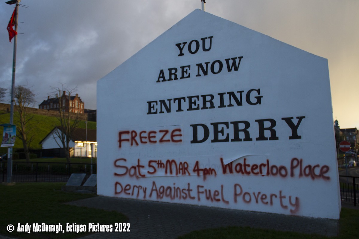 Night falls over Free Derry Corner and temperatures head down, reaching freezing before dawn this morning. To heat your home with oil currently costs roughly 460 pounds or 500 euro for a delivery of 500 litres in the area (Derry Journal). In Belfast, prices have increased 36% in two months (Belfast Live). The council characterises a household as suffering “fuel poverty” if it spends more than 10% of its income on home fuel (Derry & Strabane). To protest and demand action, the group Derry Against Fuel Poverty (Fb) is holding its second rally this afternoon at 4 p.m. in Waterloo Place.