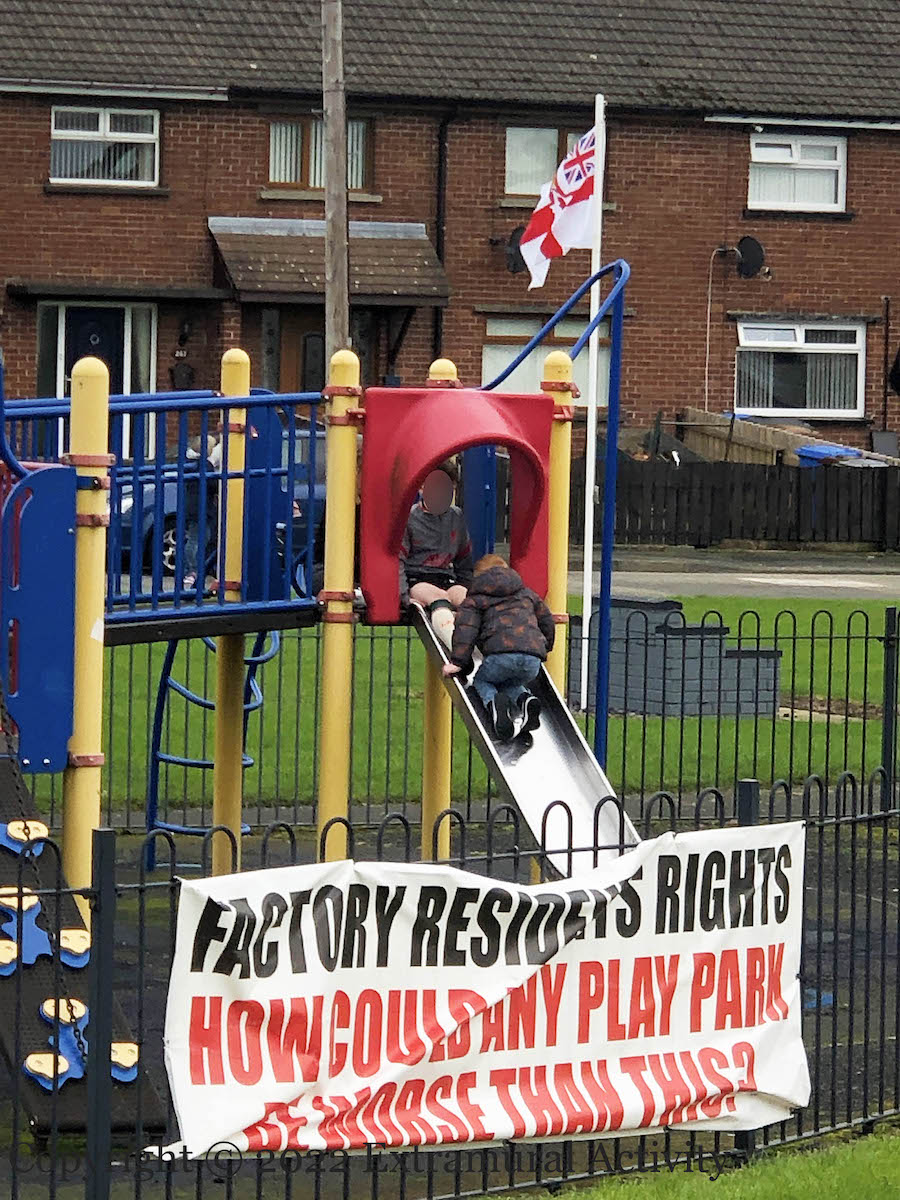 “Factory Residents’ Rights – How could any play park be worse than this?” The playground in the Factory area of Larne (Ferris Park) was closed in early 2021 because the surface was deemed unsafe. The local residents held a protest in April aimed at getting the attention of Mid- & East-Antrim council (Fb) and in October the council voted to build a new park some time in 2022 or 2023 if funding is available (NI World). As of mid-February, 2022, the playground is still in disrepair but – as can be seen from these images – it is being used by children.