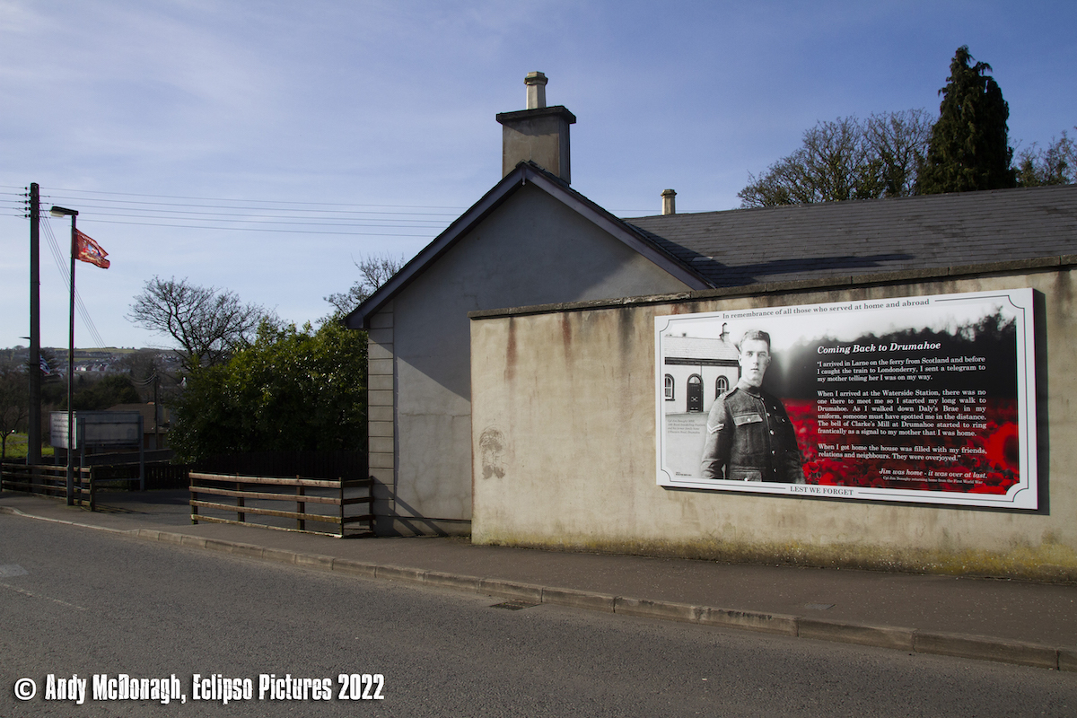 “Cpl Jim Donaghy MBE, 10th Royal Inniskilling Fusiliers and his former family home 2 Fincairn Road, Drumahoe.” The mural is on the yard wall of the house, which still stands.